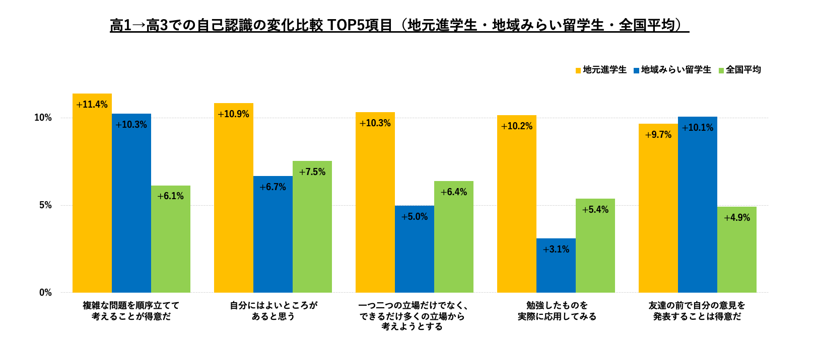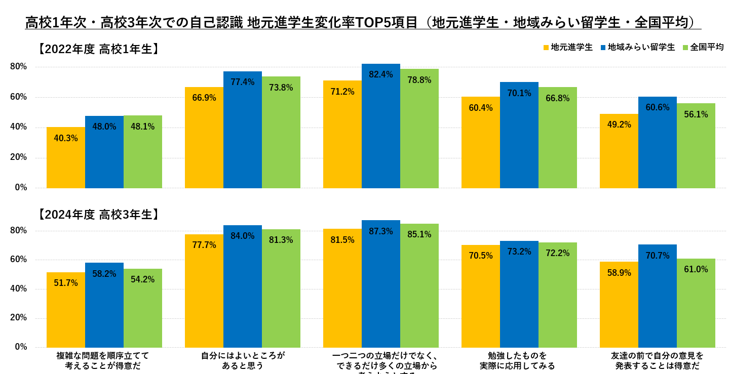 たとえば、「複雑な問題を順序立てて考えるのが得意だ」と回答した割合は、全国平均で6.1ポイントの上昇に対し、地域みらい留学校の地元進学生では11.4ポイント上昇と、最も大きな伸びが見られました。