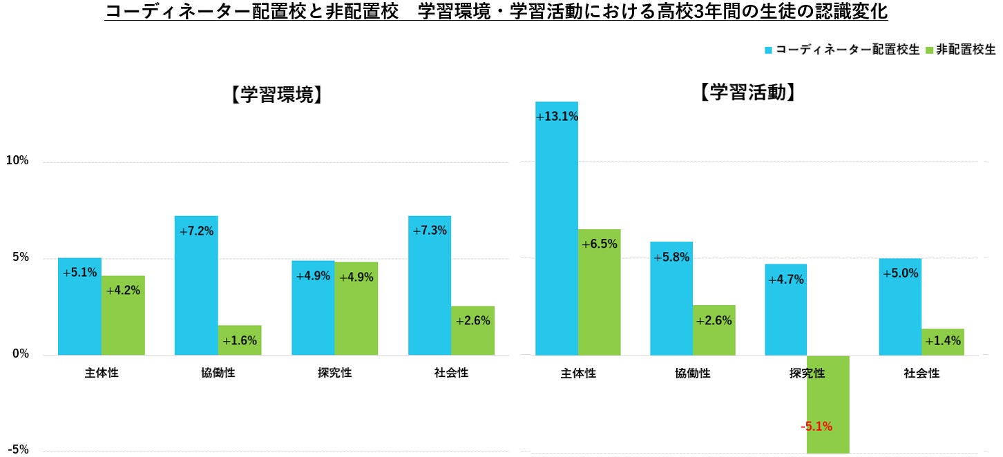 こうしたコーディネーターを配置している高校では、学習環境や学習活動の充実度に関する生徒の認識が高く、とりわけ「探究性」にまつわる項目は全国的に伸び悩む傾向がある中、コーディネーターのいる地域みらい留学校では、着実な向上(+4.7ポイント)が見られています。