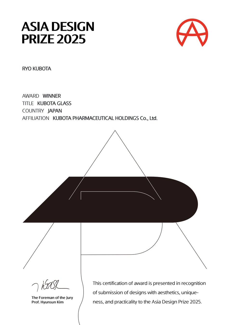 窪田製薬ホールディングス株式会社(本社:東京都港区、以下「当社」)は、当社グループが開発する「Kubota Glass」がAsia Design Prize 2025において「Winner」賞を受賞したことをお知らせします。