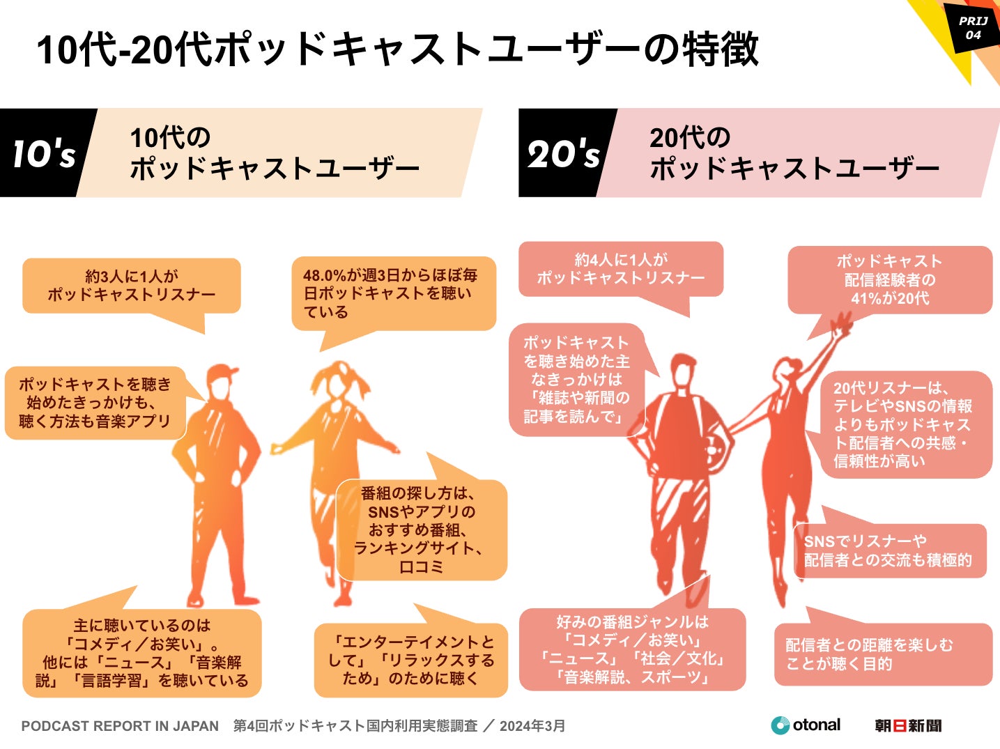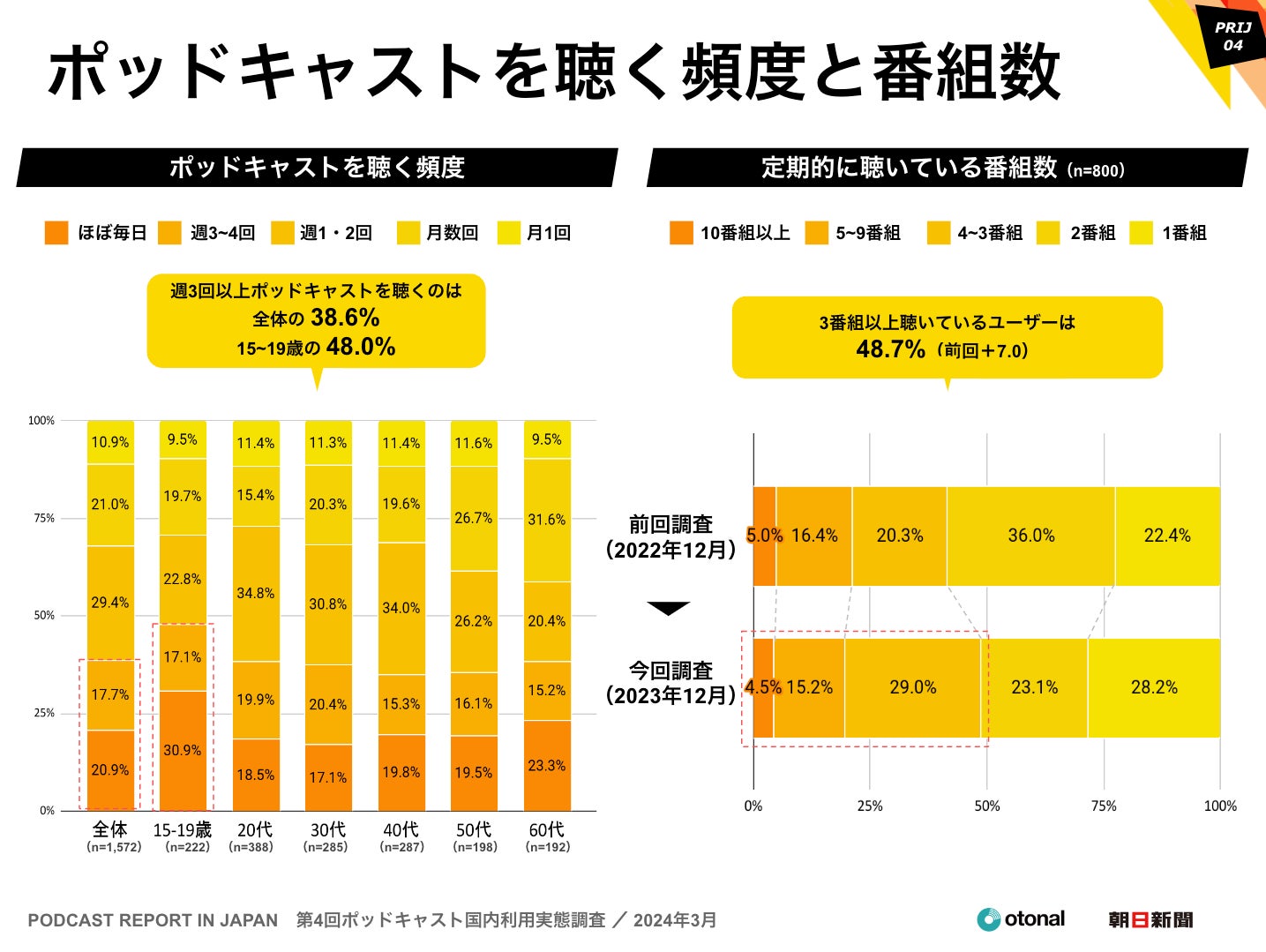 株式会社オトナル(本社:東京都中央区/代表取締役 八木太亮、以下、オトナル)および株式会社朝日新聞社(以下、朝日新聞社)は、2024年3月7日、昨年12月に共同で実施したポッドキャストの利用実態調査の概要を「PODCAST REPORT IN JAPAN 第4回ポッドキャスト国内利用実態調査」として公開しました。
