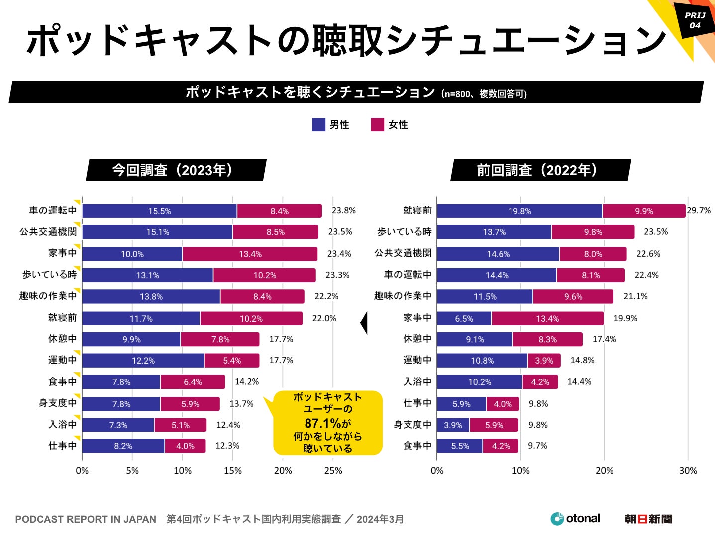 ・ユーザーのうち87.1%が、車の運転中や家事中など “ながら聴き” をしている。