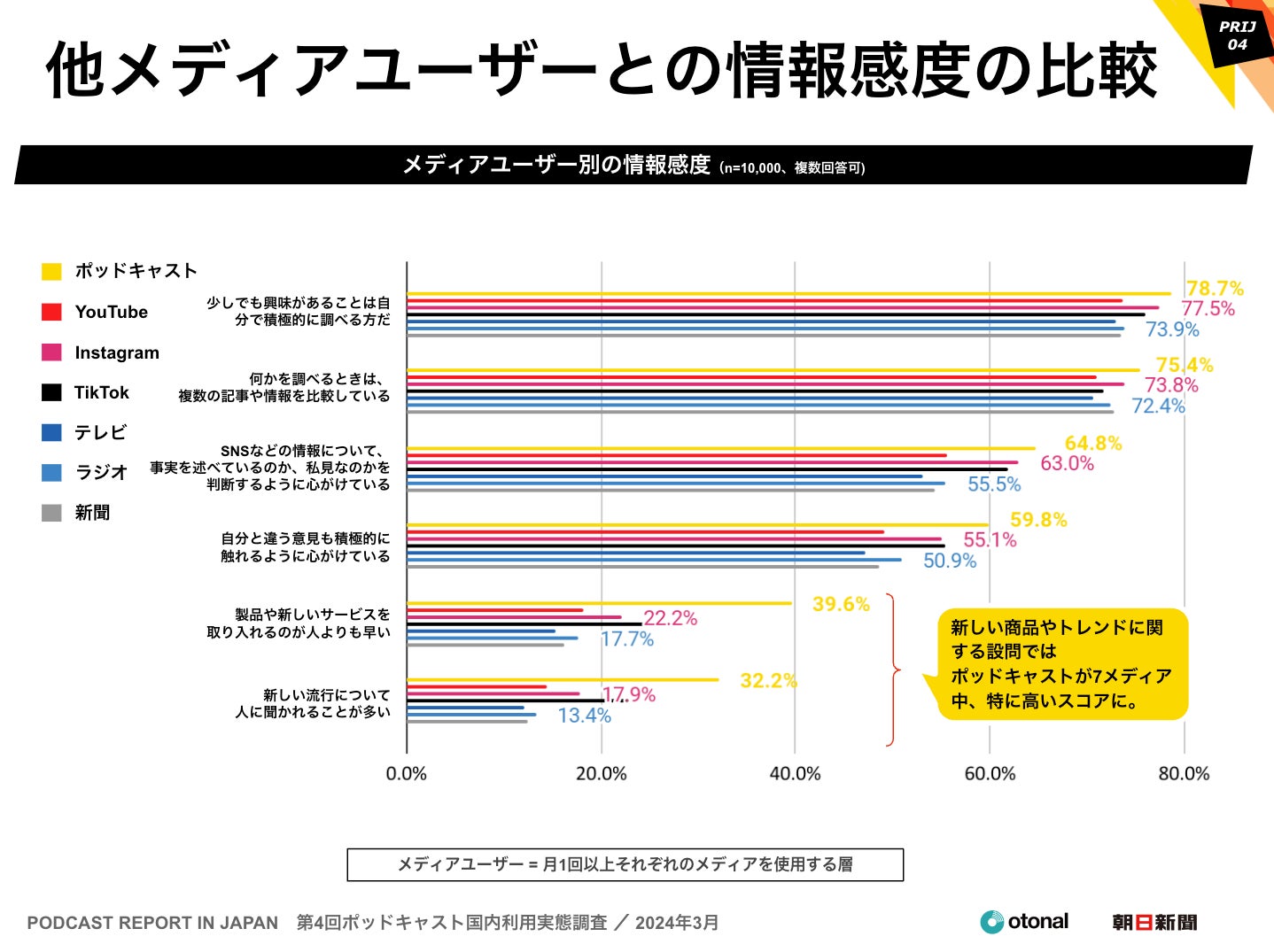 メディアユーザー別に情報感度を比較した調査では、全ての回答項目においてポッドキャストが最も高い結果となりました。ポッドキャストユーザーは、新しいトレンドへの感度が高い傾向がみられます。