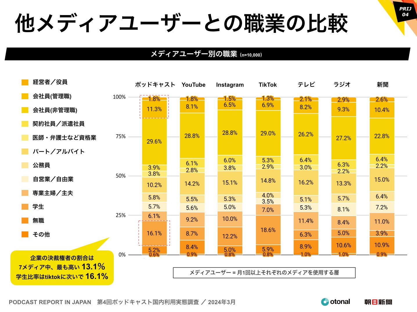 ポッドキャストユーザーの職業に関する他6つのメディアとの比較調査では、企業の決裁権者(経営者、役員、管理職)の比率が13.1%と、最も高い結果となりました。