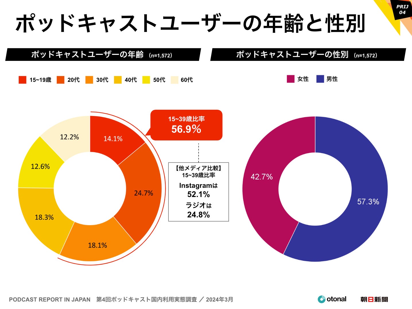 年代の比率では、ポッドキャストユーザー全体の38.8%は15〜29歳、56.9%は15〜39歳が占めています。15〜39歳の利用年代を他メディアと比較すると、Instagram、ラジオと比べて若年層ユーザー率が高い結果となっています。