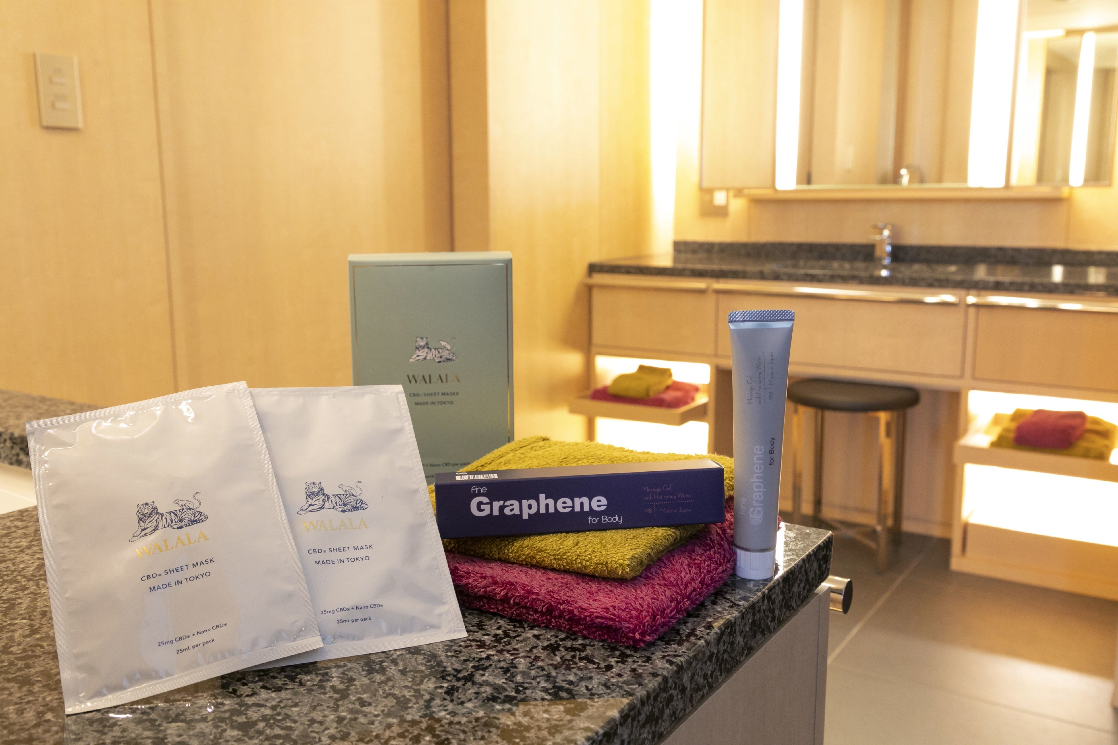客室には、LCオーナーズコミュニティ(対象のラグジュアリーカードをお持ちの会員様が⾃社のビジネスをラグジュアリーカード会員様に無料でPRできるサービス)にて好評だった商品をはじめ、ラグジュアリーカードが目利きとなりセレクトした、パートナー様の約20ブランド総額130万円相当の極上のアイテムをお部屋に取り揃え、宿泊時に手にとってご体験いただけるというユニークな取り組みです。