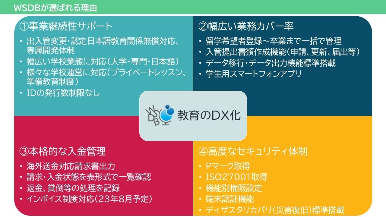 これは、認定日本語教育機関として、すべてが再審査される今までの日本語教育機関告示校と、今回新たに認定日本語教育機関として審査を受ける必要のある大学留学生別科への展開も含まれ、国際学生管理システムWSDBのさらなる進化にも繋がることを確信しています。