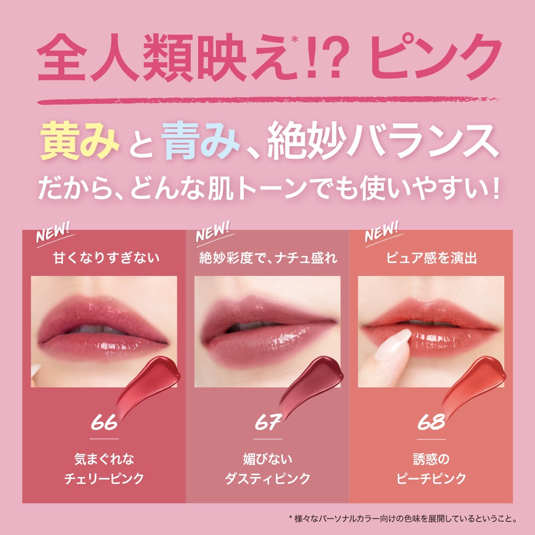 注目の新色は、甘くなりすぎない「66 気まぐれなチェリーピンク」、絶妙な彩度でナチュラルに盛れる「67 媚びないダスティーピンク」、ピュア感を演出する「68 誘惑のピーチピンク」の3色をラインナップしています。是非お試しください。