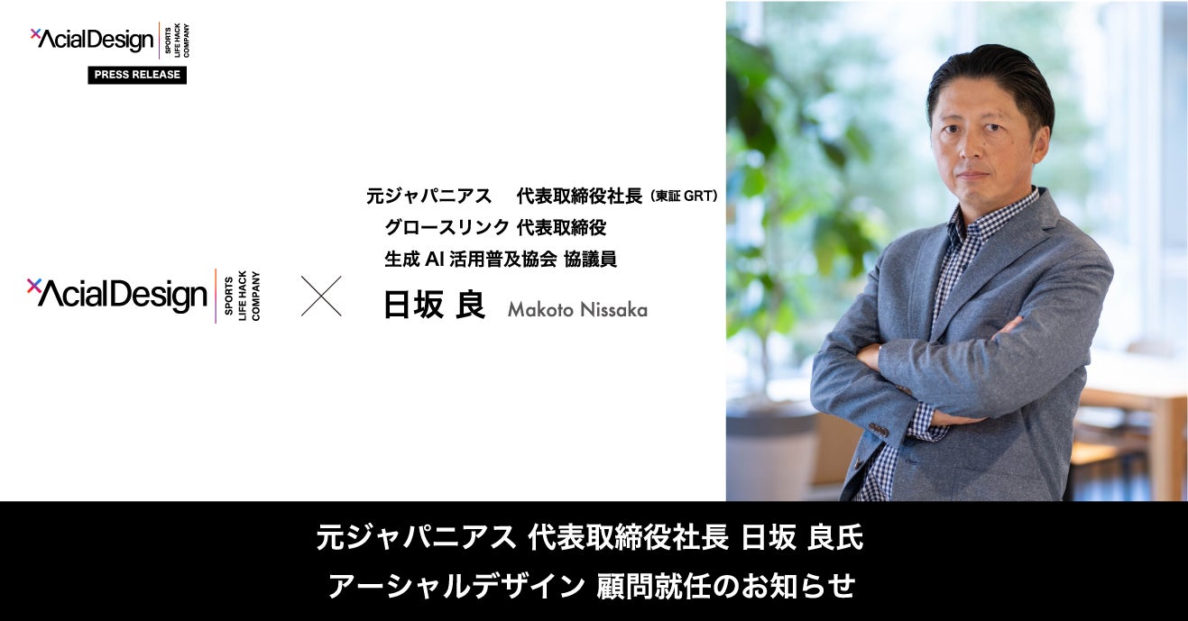 株式会社アーシャルデザイン(本社:東京都渋谷区、代表取締役CEO:小園翔太)は、主事業である「スポーツ×IT/DX事業(Athlete Agent-TECH)」のさらなる事業成長のため、新たに顧問として、ジャパニアス株式会社(東証GRT9558)の代表取締役社長を過去務め、現在 株式会社グロースリンク代表取締役、生成AI活用普及協会(GUGA)協議員を務める日坂良氏が就任したことをお知らせいたします。