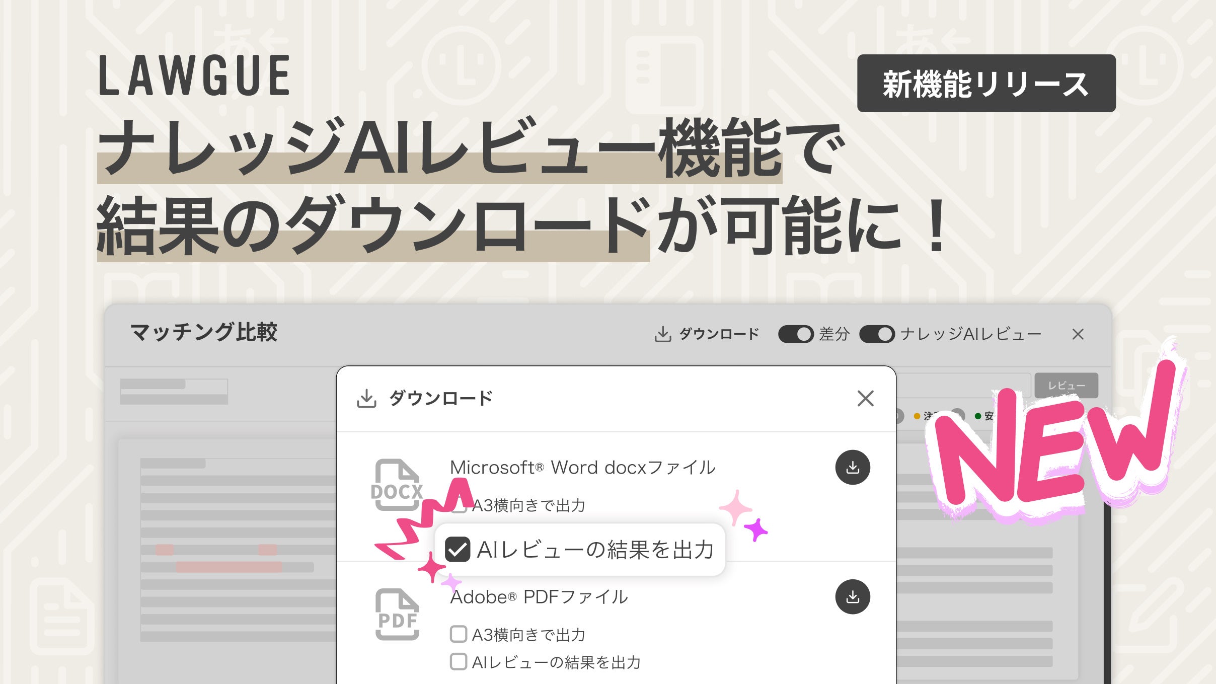 次世代AIクラウドエディタ「LAWGUE」、ナレッジAIレビュー機能にレビュー結果のダウンロード機能を追加