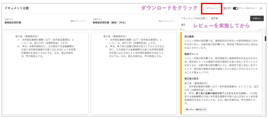 「LAWGUE」の「マッチング比較(※2)」画面でナレッジAIレビューを実行し、レビュー結果(確認ポイント)を表示させた状態で、[ダウンロード] ボタンをクリックします。