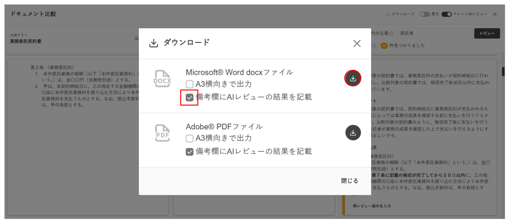 今回追加されたダウンロード機能により、Word・PDF形式でドキュメントを出力する際に、レビュー結果も併せて記載ができるようになります。これにより、出力されたファイルをそのまま社内外で共有でき、転記や追加資料の作成は不要となり、法務担当者の工数削減と業務効率化につながります。