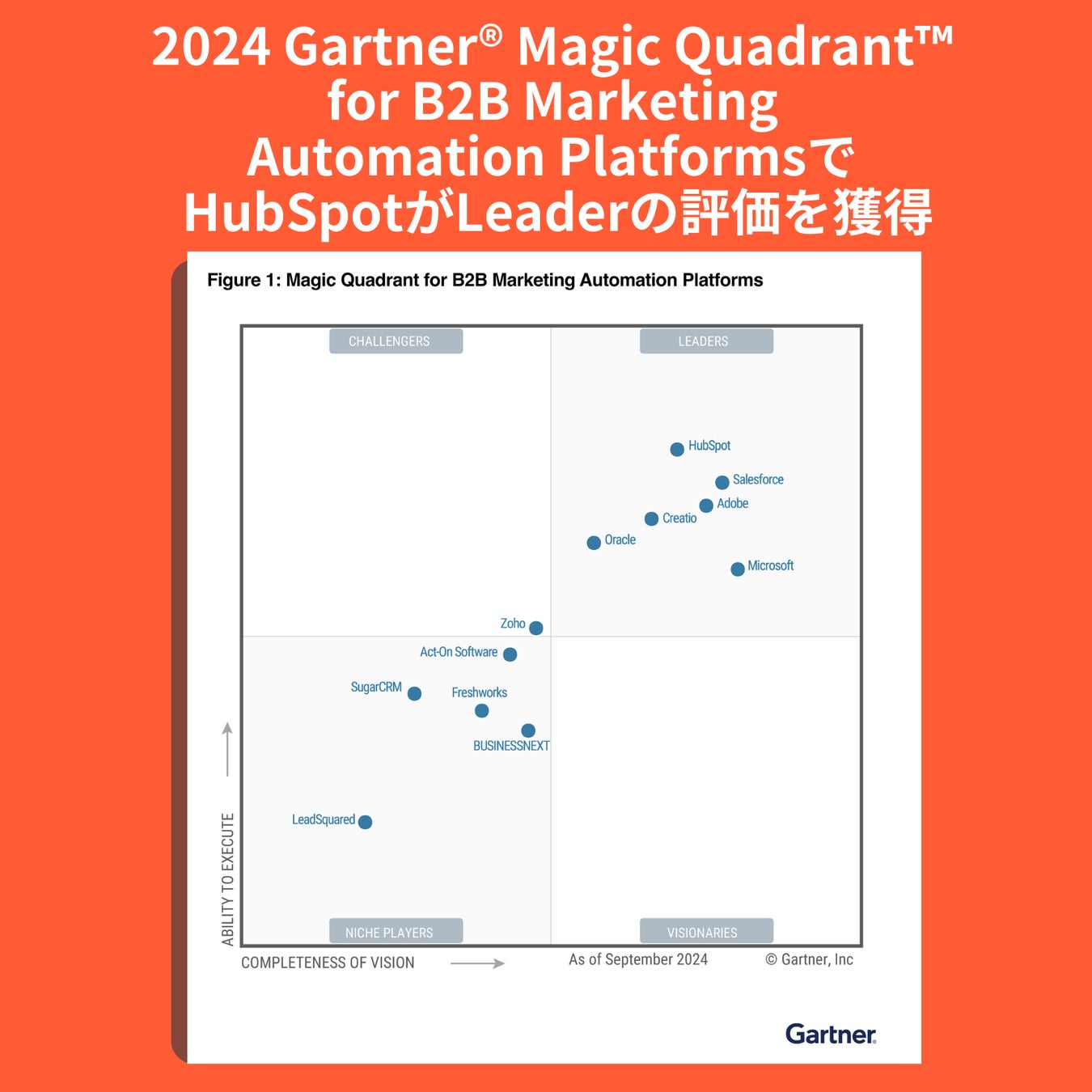 CRM搭載のカスタマープラットフォームを提供するHubSpot Japan株式会社(日本法人所在地:東京都千代田区、代表:ダン・ボグナー、以下 「HubSpot」)はこのたび、当社が提供するマーケティング支援ソフトウェア「Marketing Hub」がGartner社の調査レポート「2024 Gartner® Magic Quadrant™ for B2B Marketing Automation Platforms」(※1)において、「Leader」の評価を獲得したことをお知らせいたします。Magic Quadrantでは「ビジョンの完全性」と「実行能力」という2つの基準で評価が行われ、HubSpotのMarketing Hubは同カテゴリーにおいて4年連続でLeaderに選出されました。
