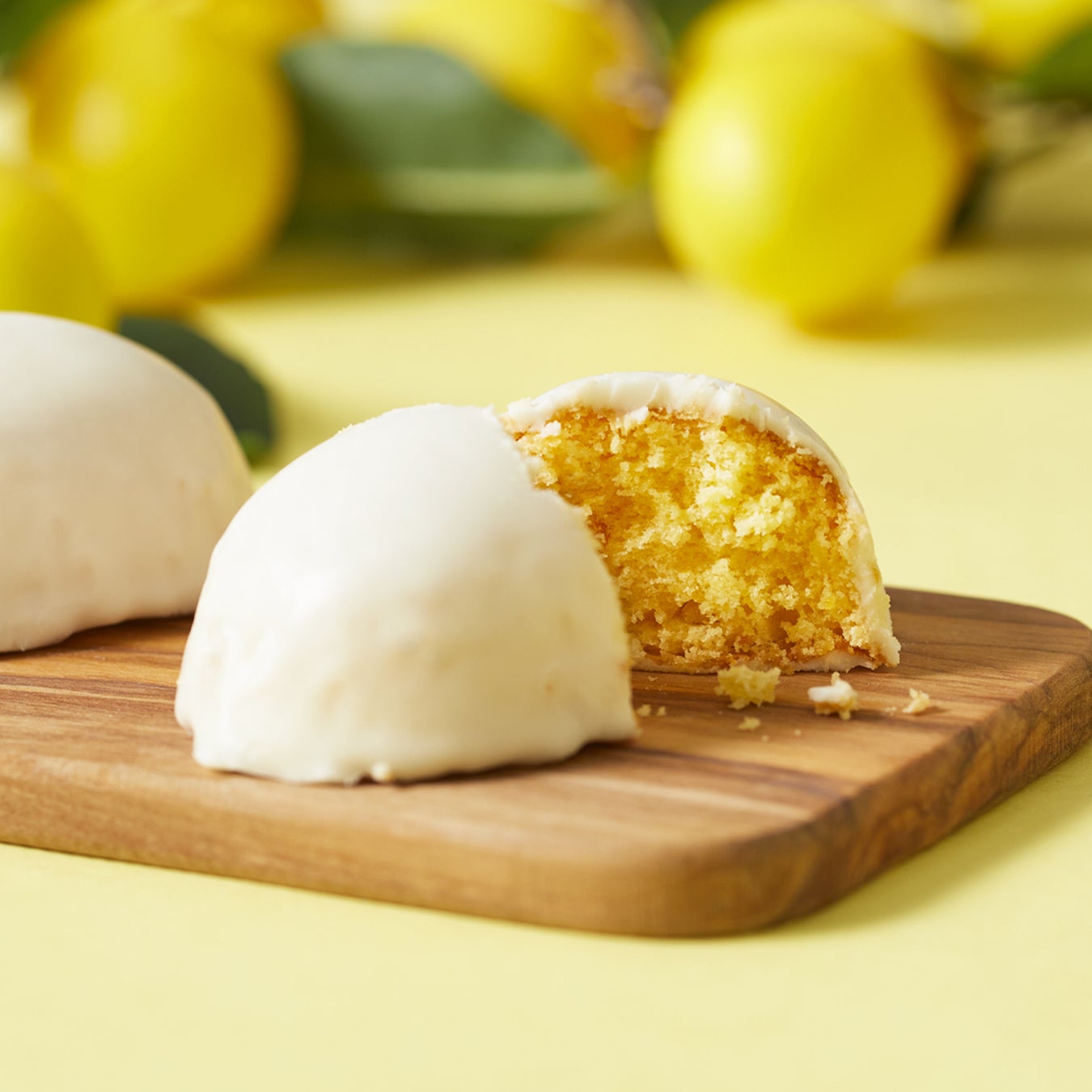 レモンピール、蜂蜜を加え、しっとりと焼き上げたスポンジ生地をレモン風味のホワイトチョコレートでコーティングしました。