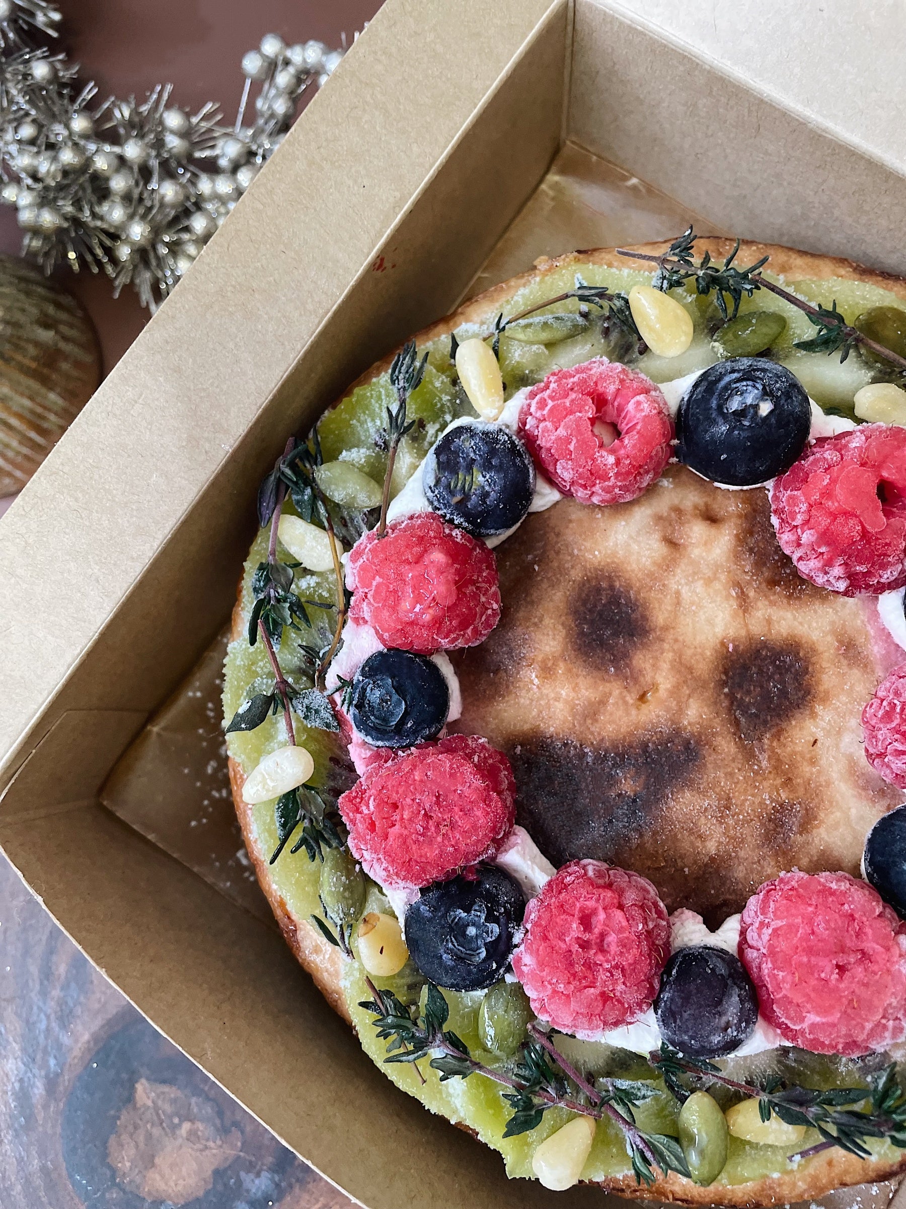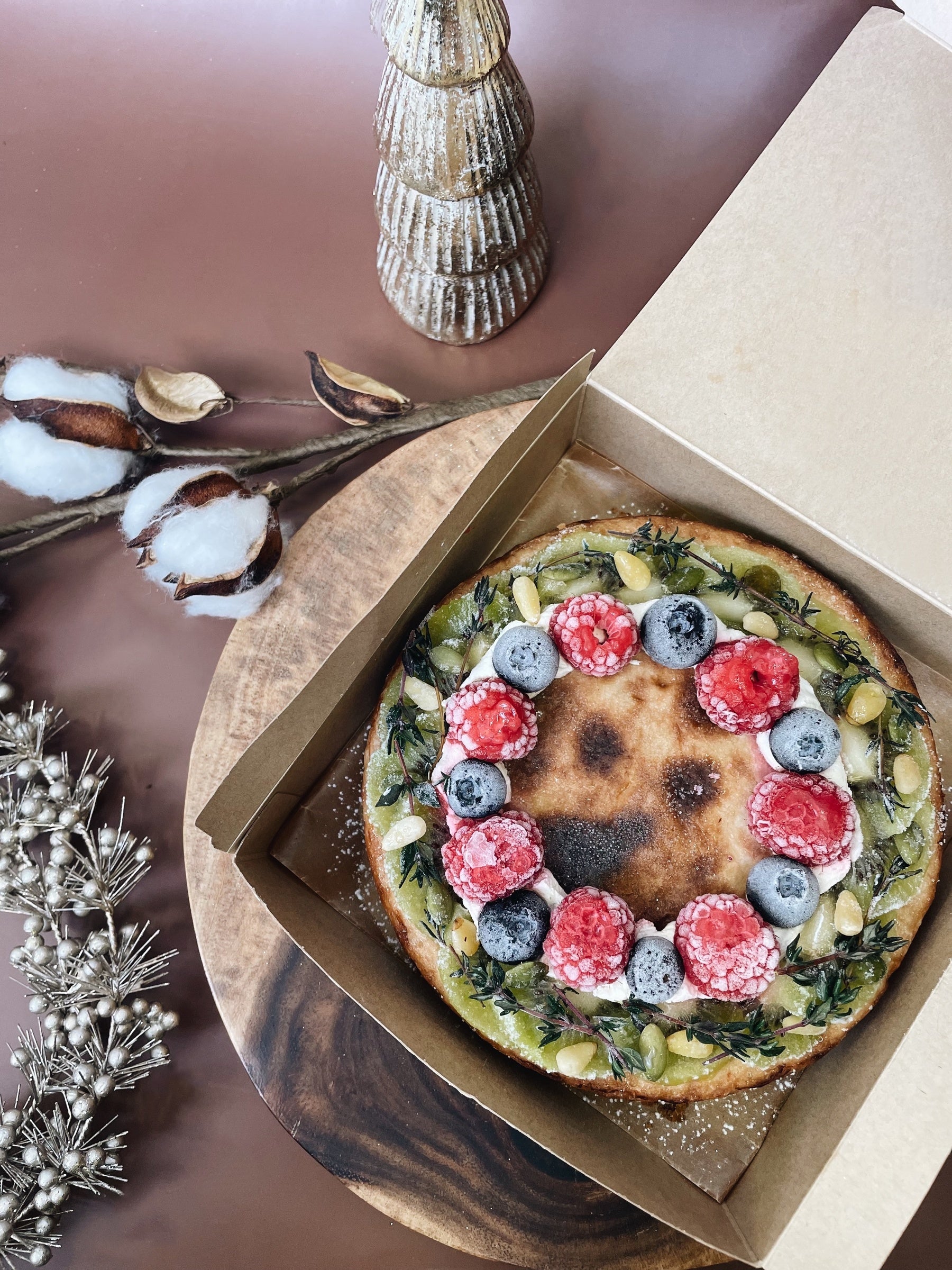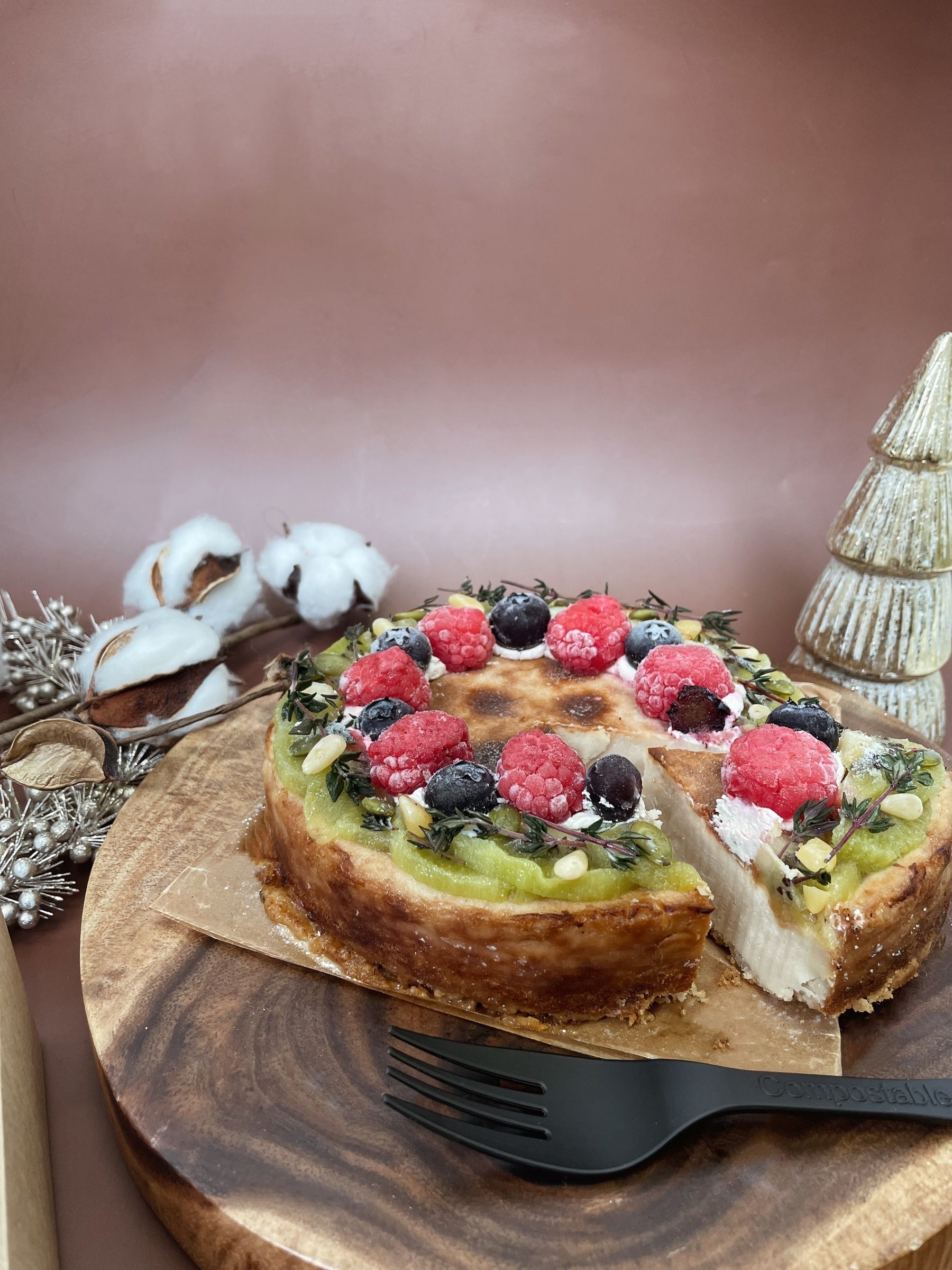 今回そんな大人気の『ヴィーガンソイチーズケーキ』に動物性食品不使用のヴィーガン生クリームと、キウイ・ブルーベリー・ラズベリーをトッピングし、クリスマスリースをイメージした『ヴィーガンソイチーズケーキ クリスマスエディション』が登場!