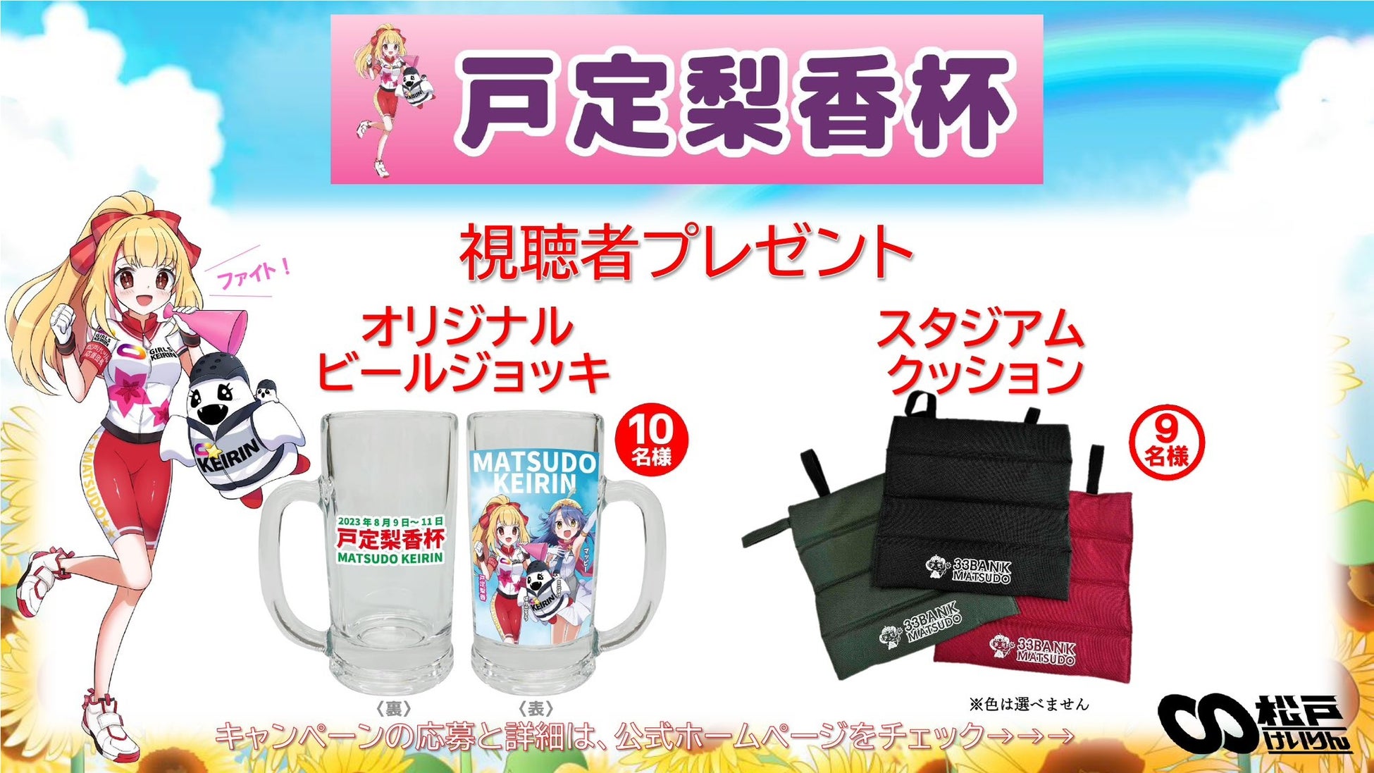 8月9日(水)と8月11日(金)には、戸定梨香本人による予想配信や、松戸競輪の公式キャラクター「マッピー」と「戸定梨香」のオリジナルデザインビールジョッキなどの視聴者プレゼント企画も催される。