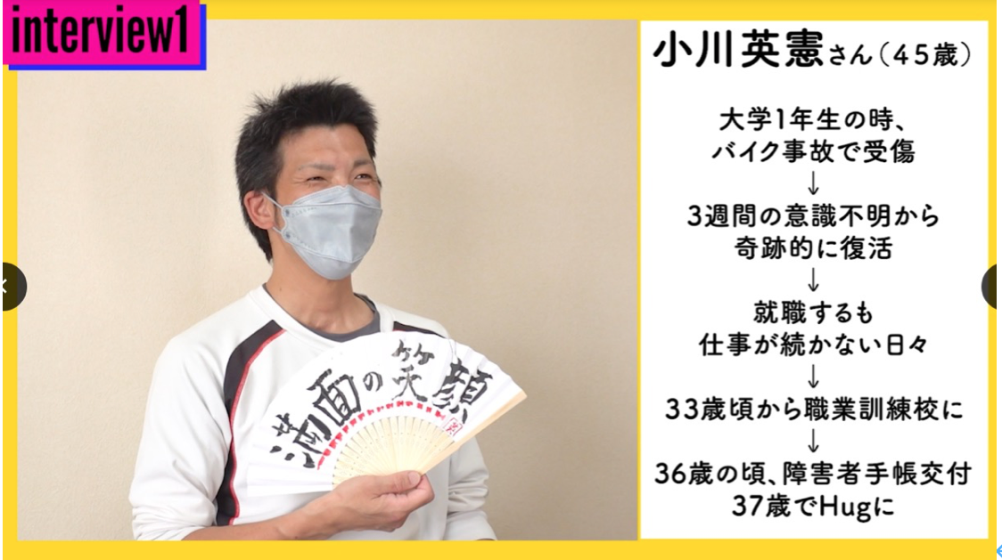 Hugで働く小川さんは大学生の頃に事故で受傷。実はそれから10年以上、高次脳機能障害だとわからずに転職を繰り返す日々がありました。当時を振り返りつつ、Hugで働くようになってから感じる今後の目標とは?八尾施設長から見た小川さんの働く様子解説も。