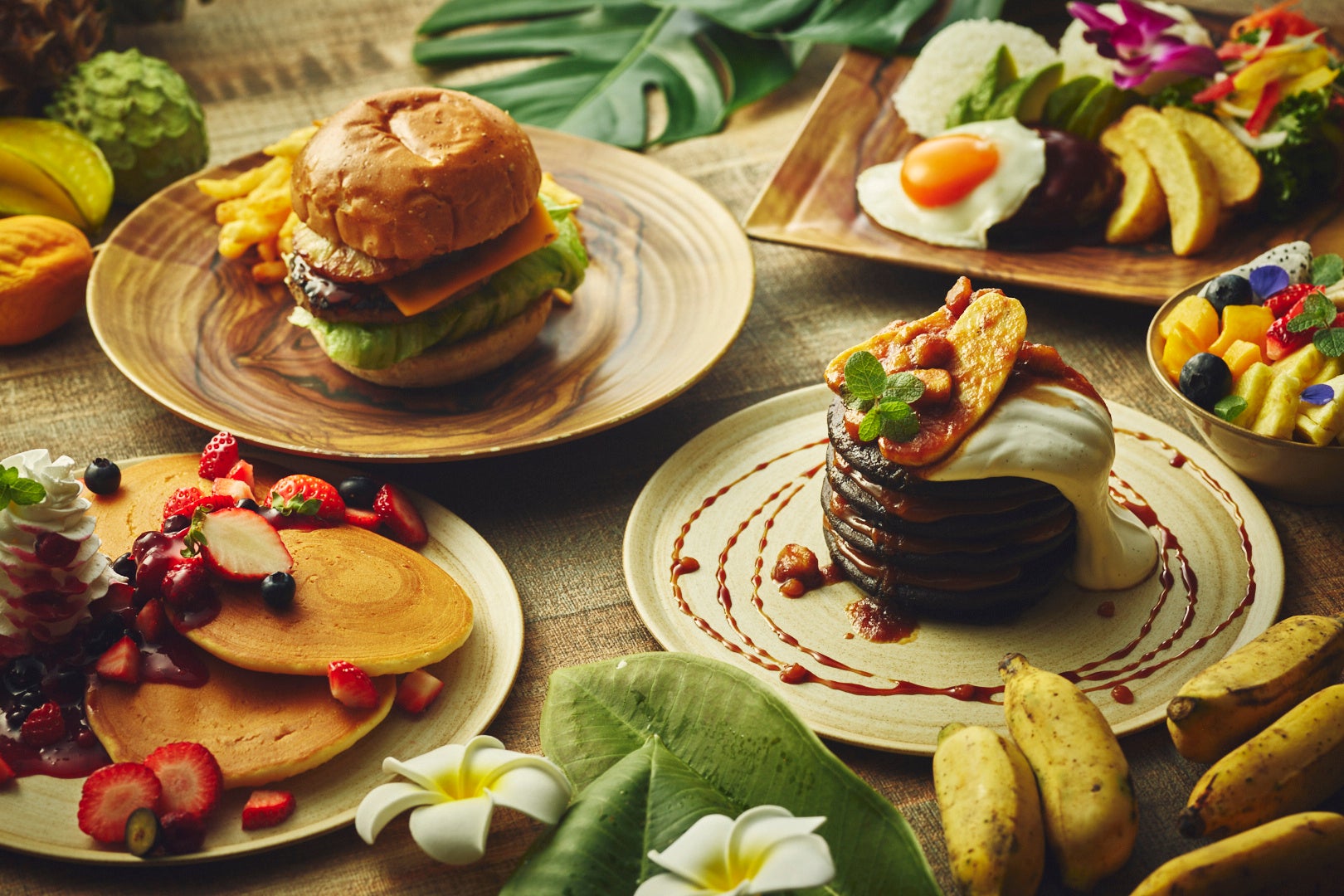 ハワイの定番メニューを、沖縄のリゾートスタイルで気軽に楽しめる、南国フレーバーのコラボレーション。ハワイアンテイストに沖縄らしいエッセンスを加えたメニューをご用意しました。心地よい海風が吹き抜けるオーシャンカフェで、ココロはずむハワイ気分のカフェタイムをお楽しみください。
