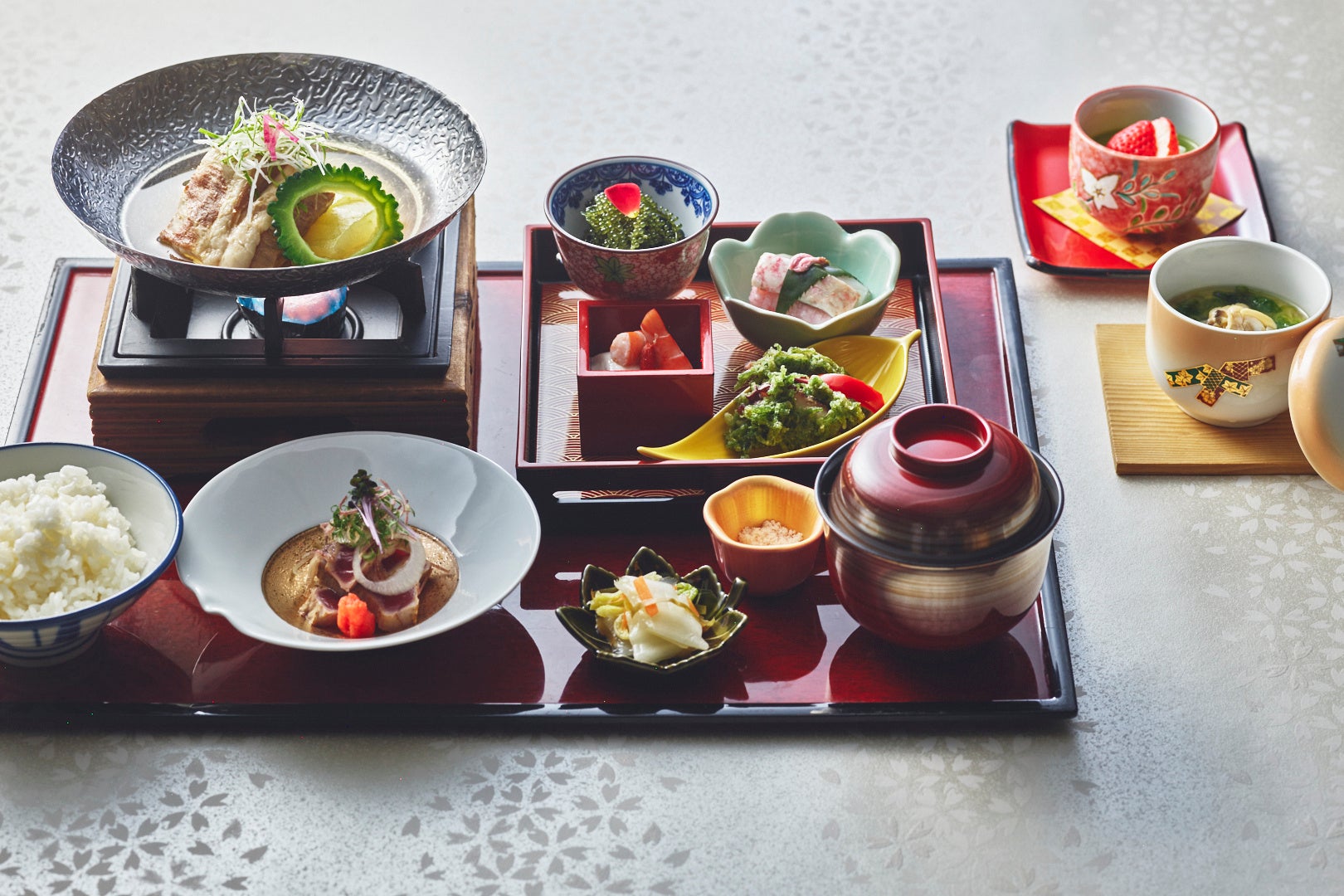日本料理「雲海」では、春の訪れと沖縄の食文化を表現した「琉球御膳」をご提供いたします。沖縄の高級魚・アカマチの桜蒸しをはじめ、旬を迎える浅利を使った茶碗蒸し、香ばしく仕上げた初鰹のたたきに加え、島ダコやアーサ、ソーキの煮物など沖縄ならではの味覚を織り交ぜました。伝統的な琉球食材を一品一品丁寧に調理し、上品で奥行きのある味わいに仕立てています。目にも美しい繊細な盛り付けとともに、季節の移ろいを感じていただける特別な御膳です。