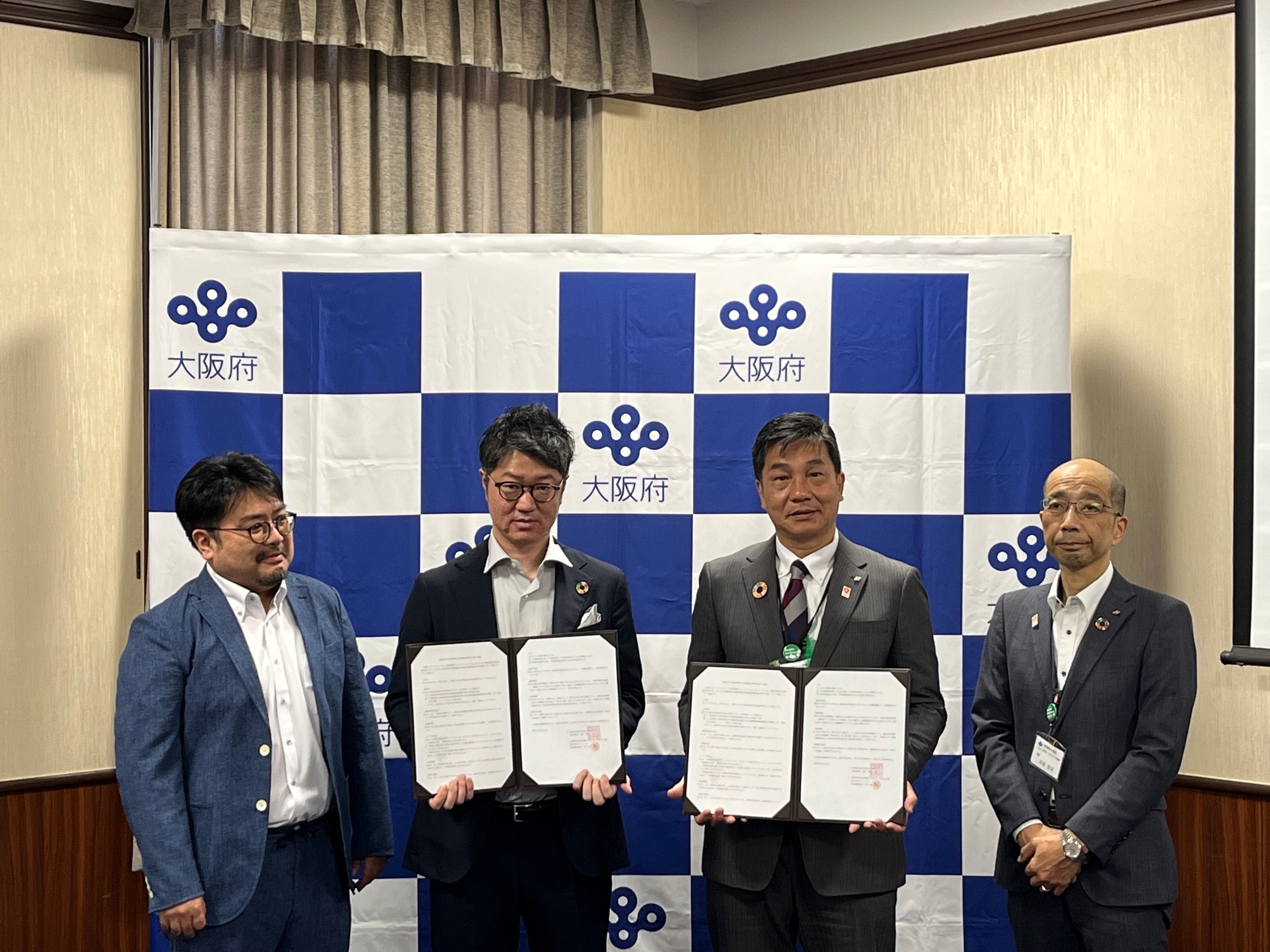 左から、株式会社エナーバンク共同創業者COO佐藤、共同創業者代表取締役村中、大阪府環境農林水産部原田部長、脱炭素・エネルギー政策課水田課長
