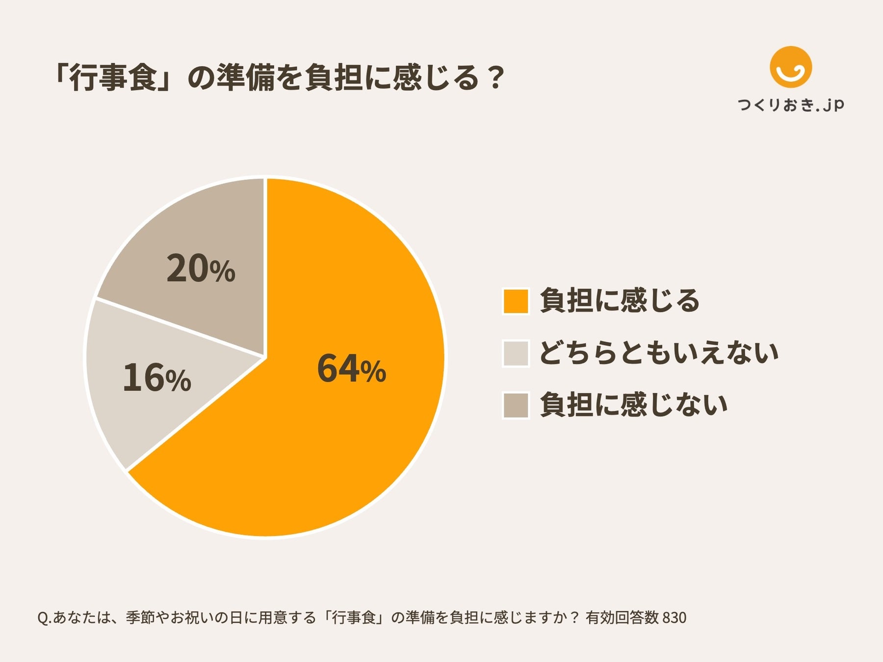 季節やお祝いの日に用意する「行事食」の準備負担について調査した結果、全体の64%が行事食の準備に負担を感じていることが分かりました。