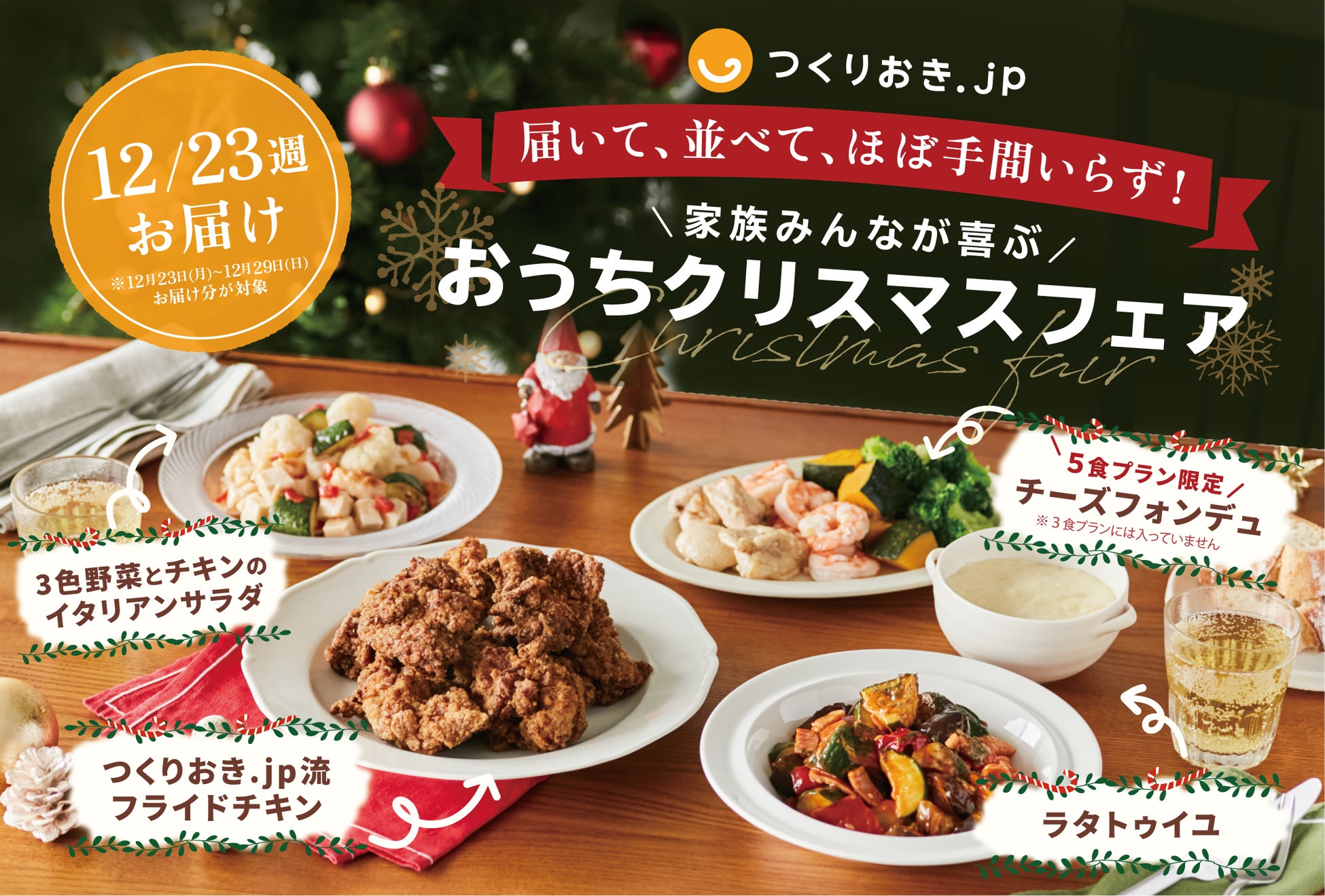 手作りおかずの宅配サービス「つくりおき.jp」では、家族で楽しむクリスマスを手軽に実現するため、「家族みんなが喜ぶ おうちクリスマスフェア」を開催します。12月23日週のメニューで、クリスマスの定番のフライドチキンをはじめ、チーズフォンデュ(5 食プランのみ提供)、ラタトゥイユ、3色野菜とチキンのイタリアンサラダをお届けします。