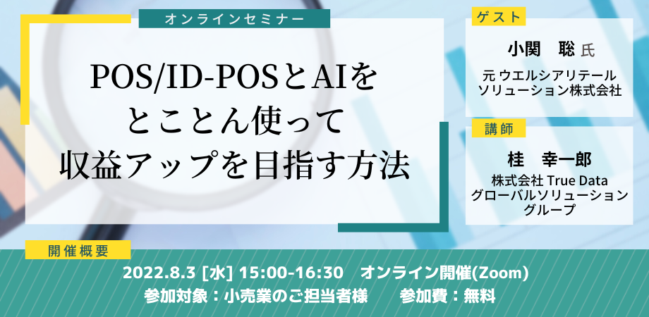 株式会社True Data(トゥルーデータ/本社:東京都港区、代表取締役社長:米倉 裕之)は、2022年8月3日(水)15時より、小売業の方向けのオンラインセミナー「POS/ID-POSとAIをとことん使って収益アップを目指す方法」を開催します。