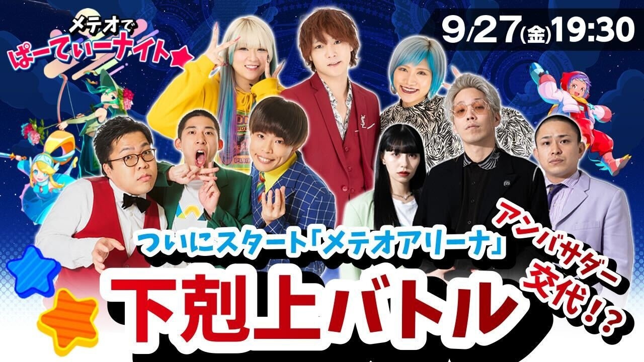 第3回目となる今回の配信ではMCのお笑いトリオ「ぱーてぃーちゃん」に加え、ゲストに大人気トリオ・怪奇!YesどんぐりRPG、リンダカラー♾️の二組をお迎えし、『メテオアリーナ』の「公認アンバサダー」をかけた争奪バトルを生配信でお届けいたします。是非とも配信で確認してみてください。