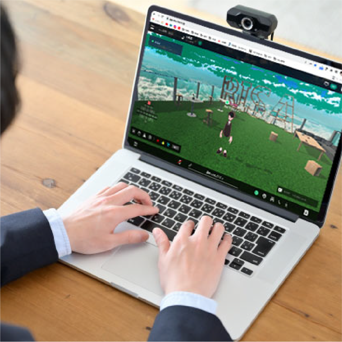 テレワーク環境で失われた、”いつでも集まれる場所を共有する体験”を離れていても実現する次世代のワークプレイスです。モーション機能や一言つぶやき機能などコミュニケーションが自然と発生するような仕掛けを随所に配しています。特別な機材や設定は不要で通常のPCのブラウザ上で動作します。