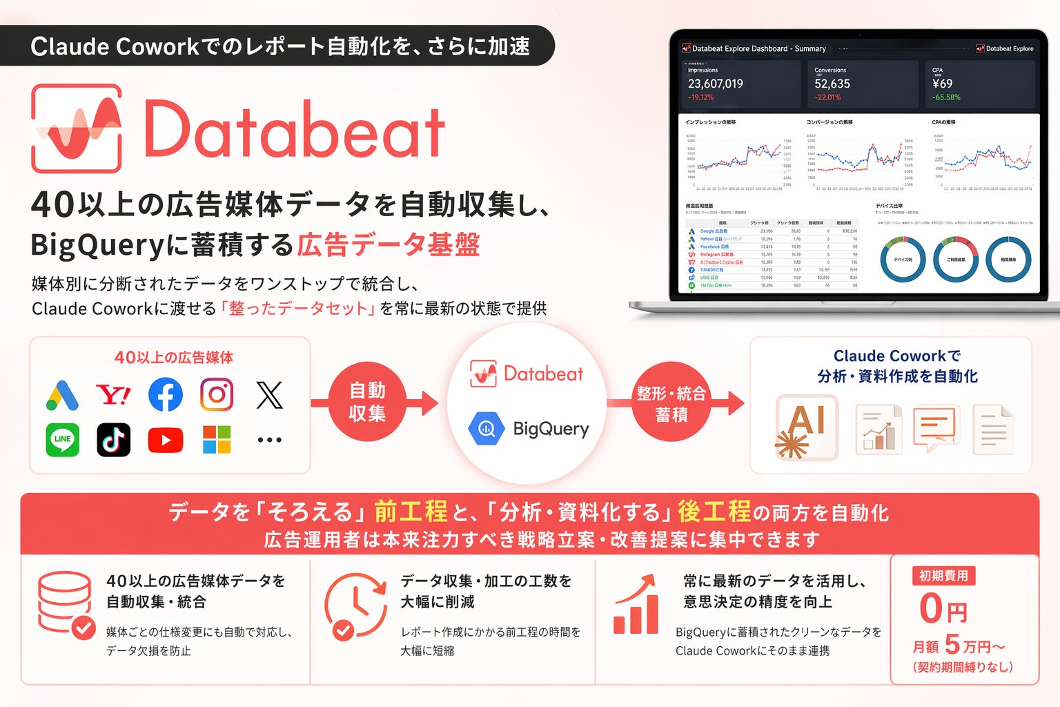 Claude Coworkでの分析・資料作成に必要な「広告データの収集・整形」作業を、Databeatで大幅に短縮できます。