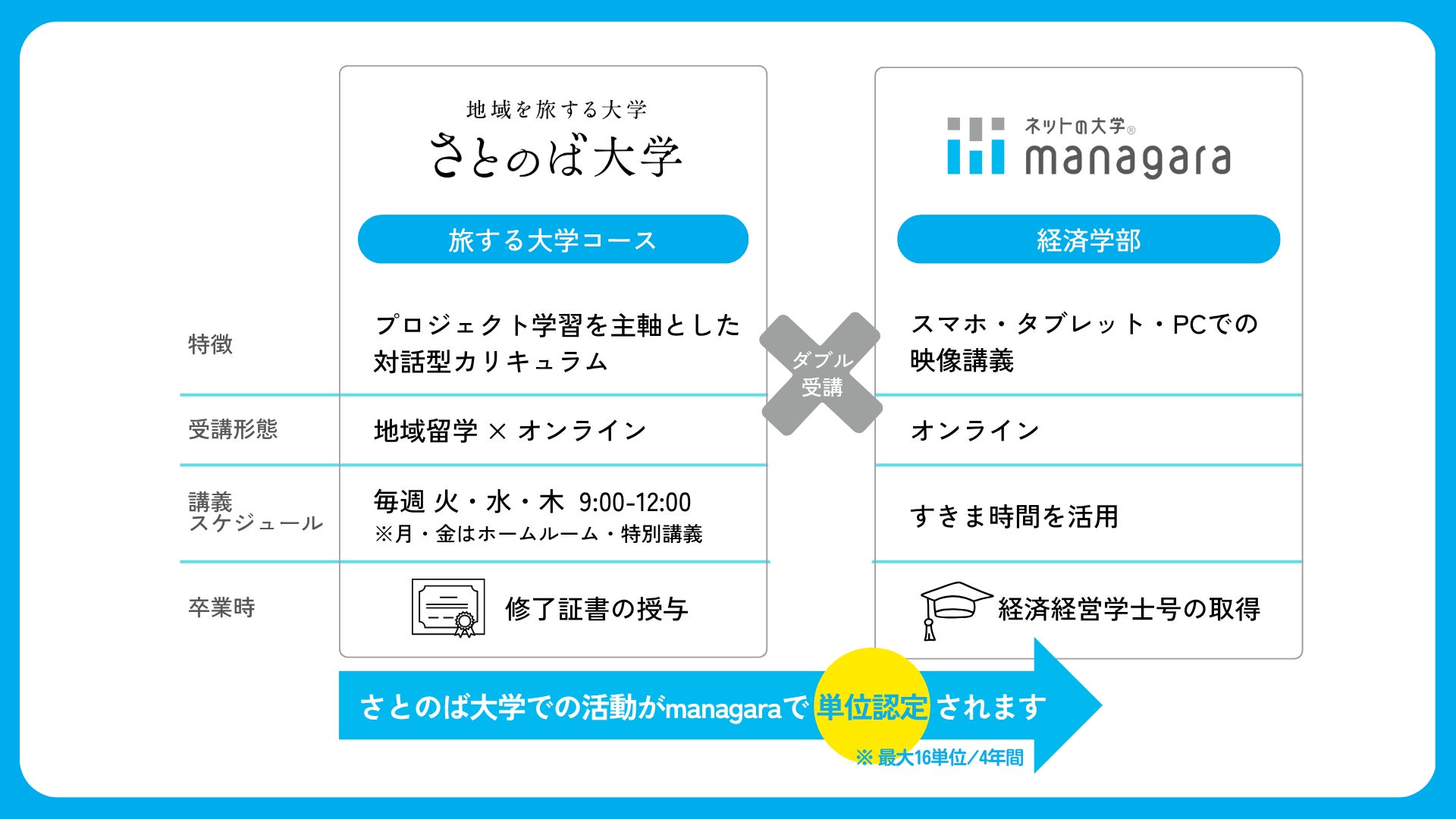 この度、提携大学である「ネットの大学managara」と共同運営する「地域イノベータコース」に所属する学生を対象とし、地域に暮らしながら学び、プロジェクト実践に取り組むさとのば大学の活動が、ネットの大学managaraの単位として認定されることとなりました。4年間で最大16単位の取得が可能となります。