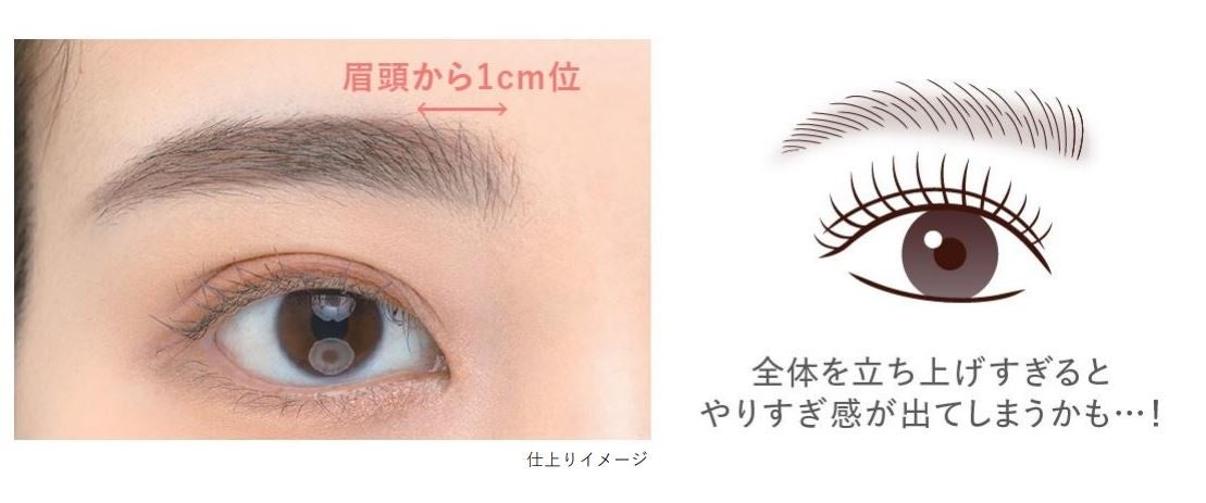 眉頭の1cmを立ち上げるように塗ると、のっぺり眉→やりすぎ感のない立体眉に!