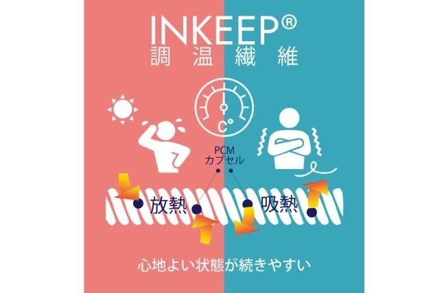 今回、着心地を最大限に追求し、楽スマから新たに生まれたのが、イージングウェアシリーズ『着温 – KiON -』。このシリーズ全てのアイテムには、温度変化に応じて吸熱・放熱を繰り返す【PCM調温素材】を採用しています。