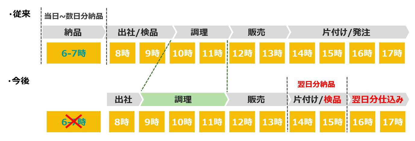 食材の納品時間が、使用する当日の早朝(6-7時)から使用する前日の日中(14-16時)へ変わることで、比較的業務に余裕のある時間帯に食材の納品・検品が可能となります。当日分の調理や翌日分の仕込みの時間がさらに確保でき、給食提供先の生産性向上を実現します。