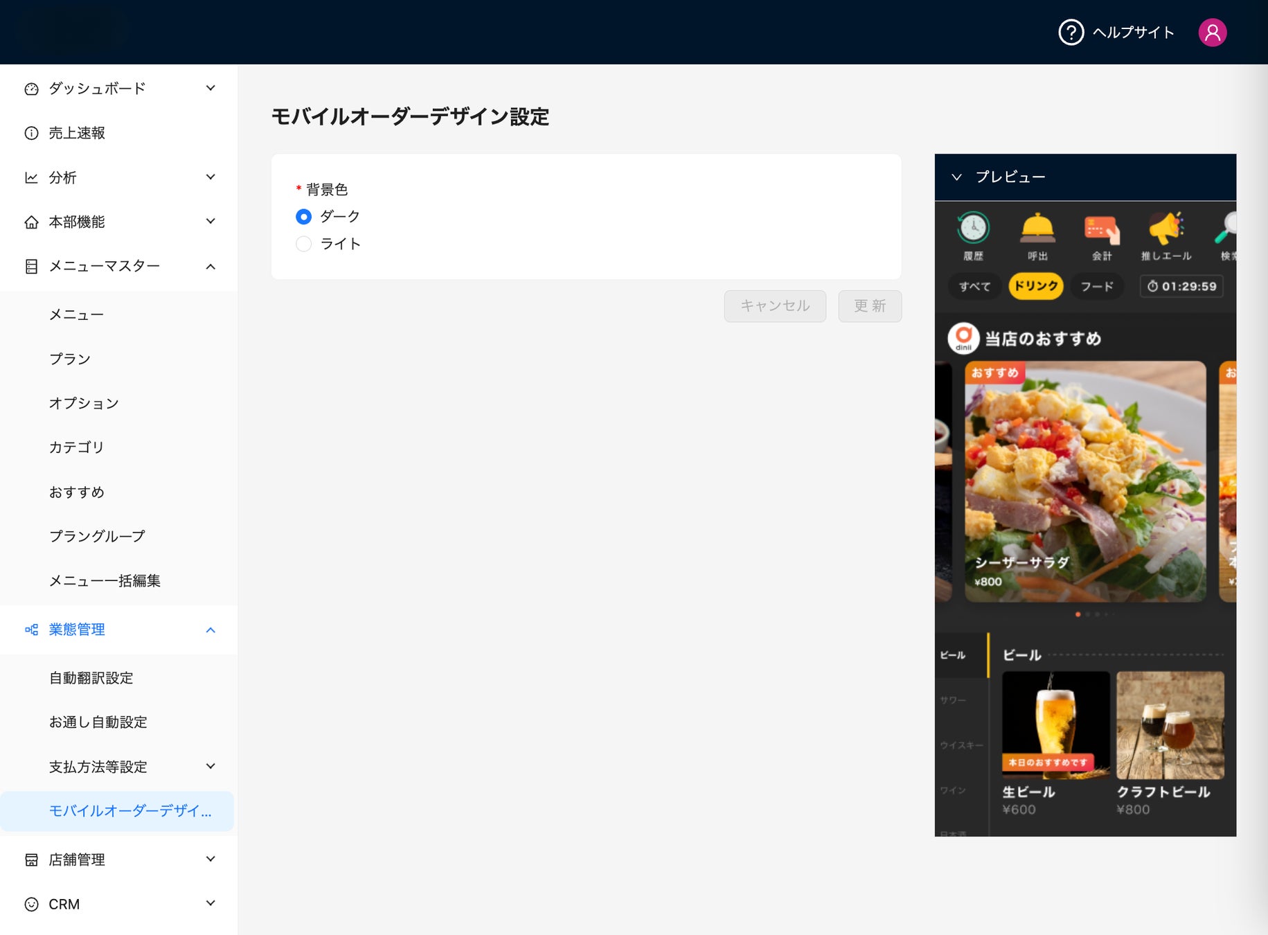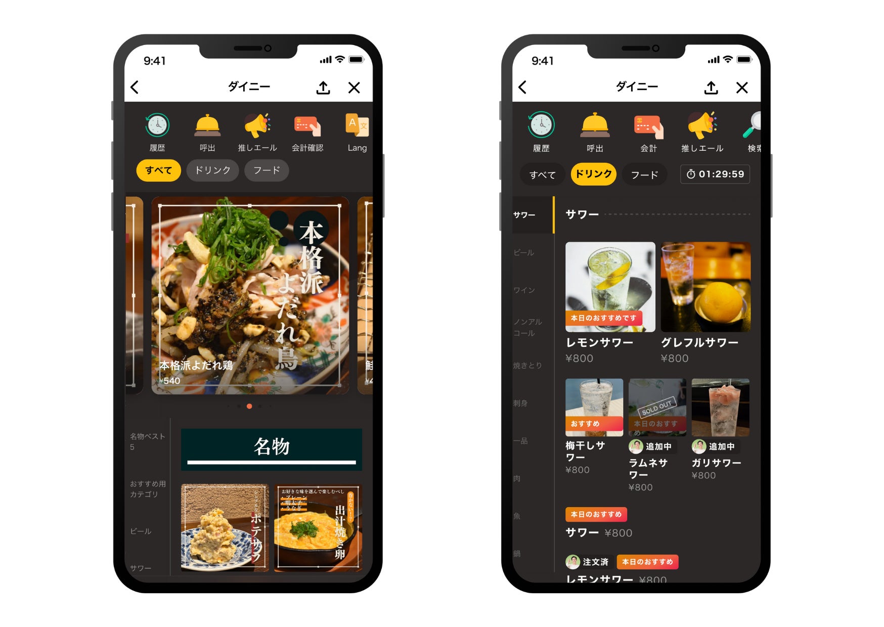 これまでモバイルオーダーの背景色はライトのみでしたが、複数の法人・飲食店から、お店の雰囲気に適した背景色の導入のご要望をいただいており、この度「ダイニーモバイルオーダー」の背景を黒を基調とした「ダークテーマ」をデフォルトに設定しました。