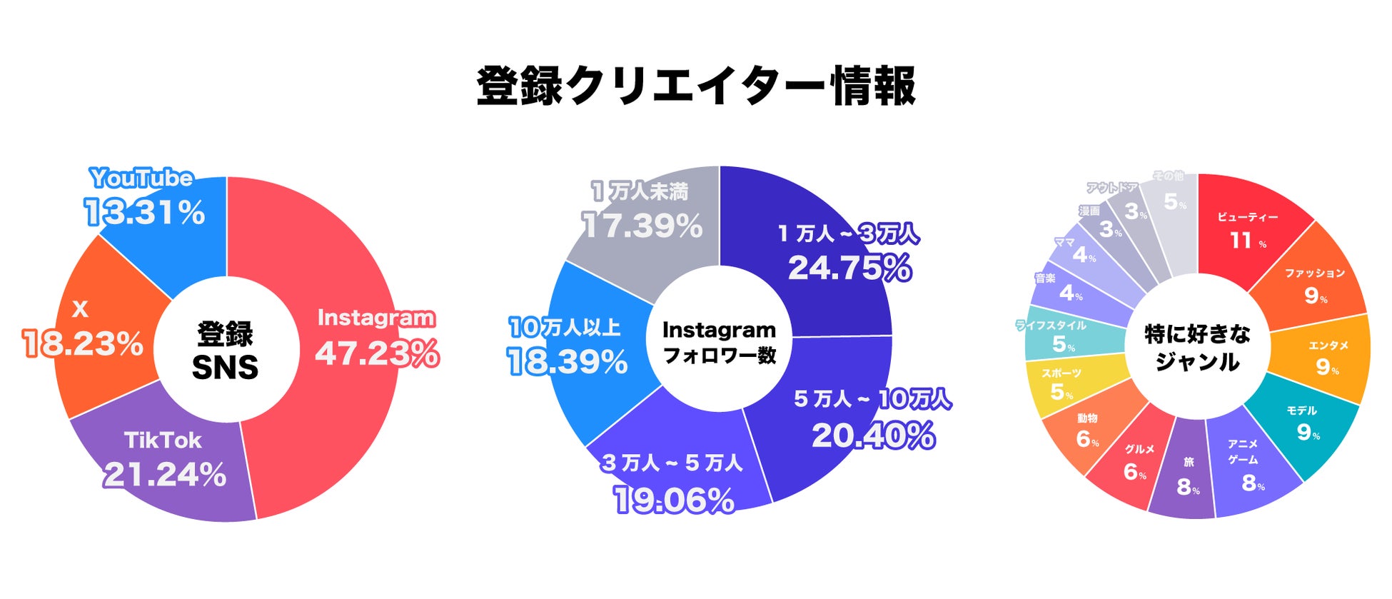 また、α版リリースから3ヶ月で登録クリエイター総フォロワー数が4,500万人突破した”HYPE CAST AI”のデータベースは、Instagramを中心に、中規模(3万人)以上のフォロワー基盤を持つクリエイターが多いだけでなく、TikTokやXなど、複数のプラットフォームで活躍するクリエイターが存在しており、ビューティーやファッションを中心に、幅広いジャンルをカバーしているので多様な広告ニーズに対応可能です。