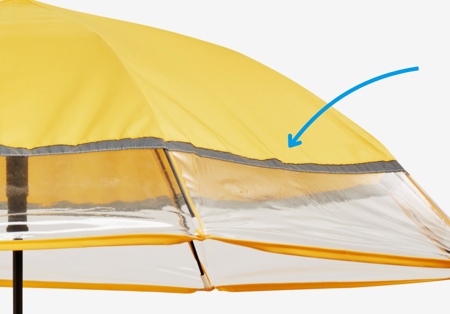 透明なビニール素材の切り継ぎデザインで、視界を確保しやすい設計です。一般的なキッズ傘のように一部のみが透明な仕様と異なり、傘の向きを調整することなく自然な姿勢で周囲を確認できます。