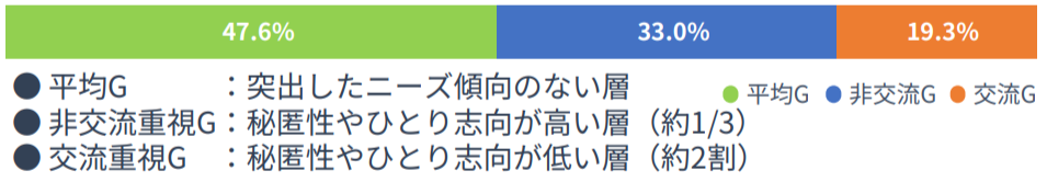 「一人で静かに過ごしたい」「知っている人に会いたくない」というニーズが極めて高い層(非交流重視グループ)が、交流を重視する層(約2割)を上回る結果となりました 。
