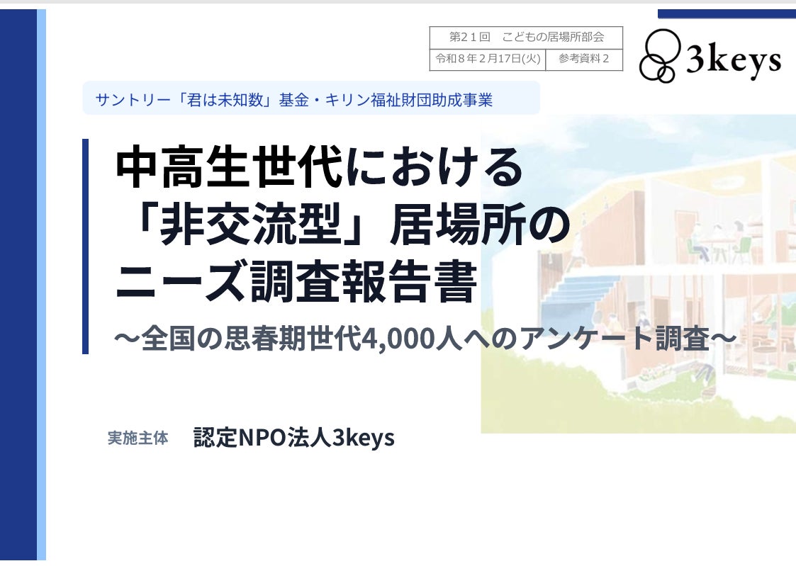 認定NPO法人3keys(東京都新宿区、代表理事:森山誉恵)は、全国の13歳〜18歳の中高生世代約4,000人を対象に実施した「中高生世代における『非交流型』居場所のニーズ調査」の結果を公表いたしました。本調査は、こども家庭庁の「こどもの居場所部会」でも参考資料として取り上げられた、当事者視点による大規模な実態調査です。