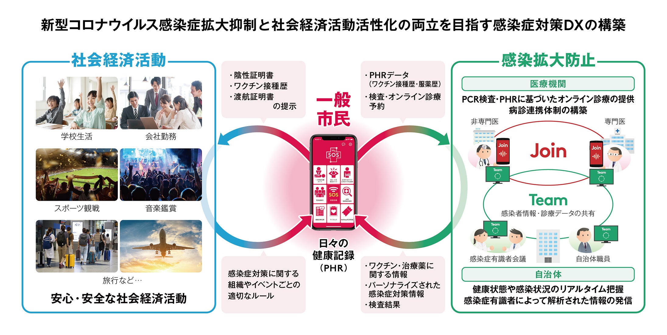 MySOSおよびTeamを活用し、自治体が一般市民の健康状態や感染状況をリアルタイムに把握できる仕組みを構築する。把握した情報は感染症有識者によって解析され、MySOSを通じてパーソナライズされた感染症対策情報として一般市民に通知される。