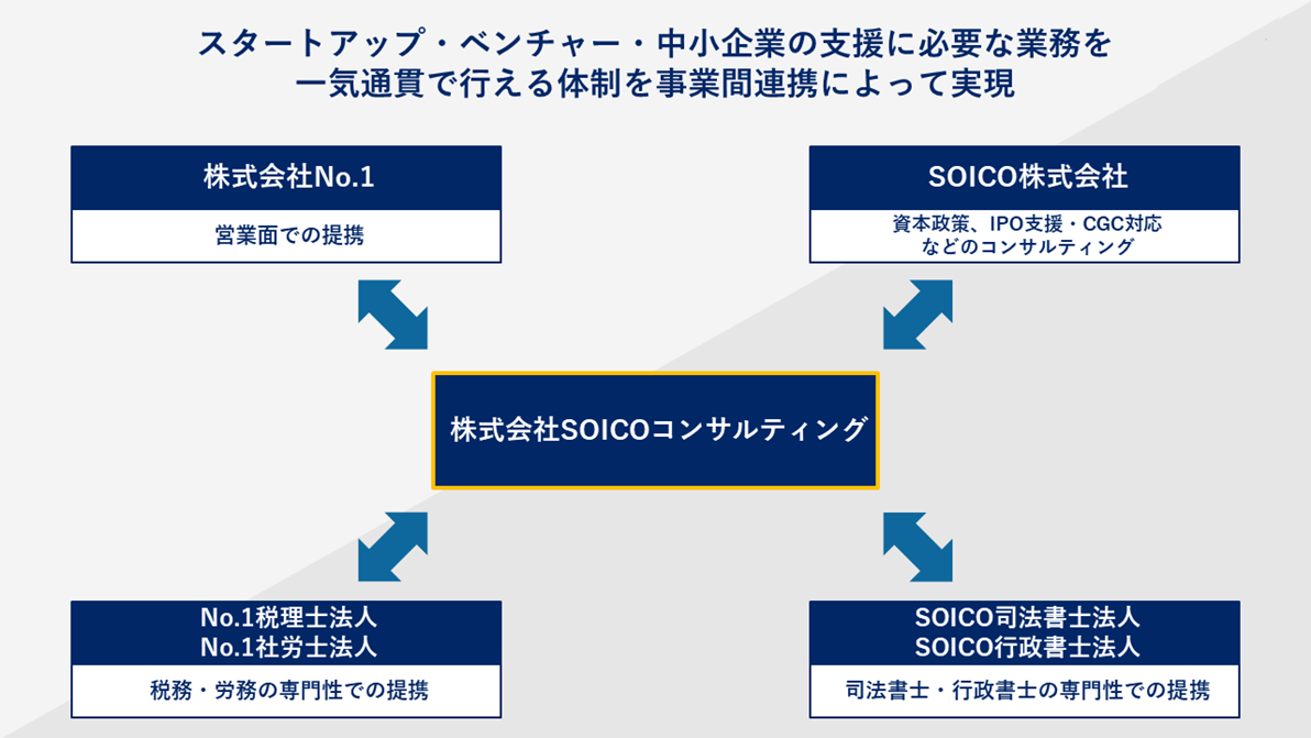 SOICOは、これまで資本政策に関するコンサルティング及び人材紹介事業を中心に、スタートアップ・ベンチャー企業の支援を行ってまいりました。当該サービスを提供する中で、新株予約権の登記業務や税理士業務、人材採用・教育に係る補助金・助成金の申請サポート業務を一気通貫に提供を受けたいという企業側のニーズを日々感じておりました。