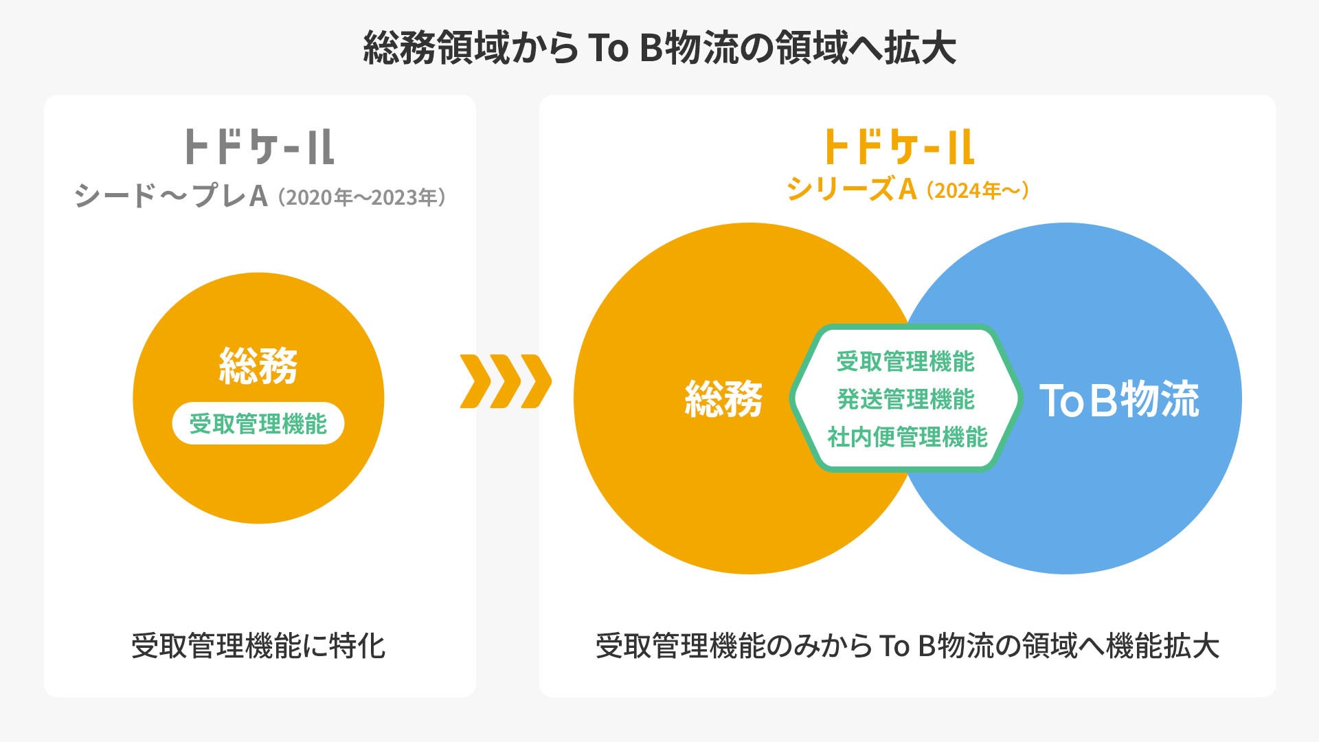 今回の資金調達では、すでに多くの大手企業に導入されているクラウド配達物・郵便物管理アプリケーション「トドケール」を中核サービスと定め、さらなる顧客基盤拡大に向けて営業・カスタマーサクセス(CS)の人材の採用強化を行い、物流との連携・周辺総務領域への拡大を含めた機能開発に向けた開発チームの採用の強化を行います。