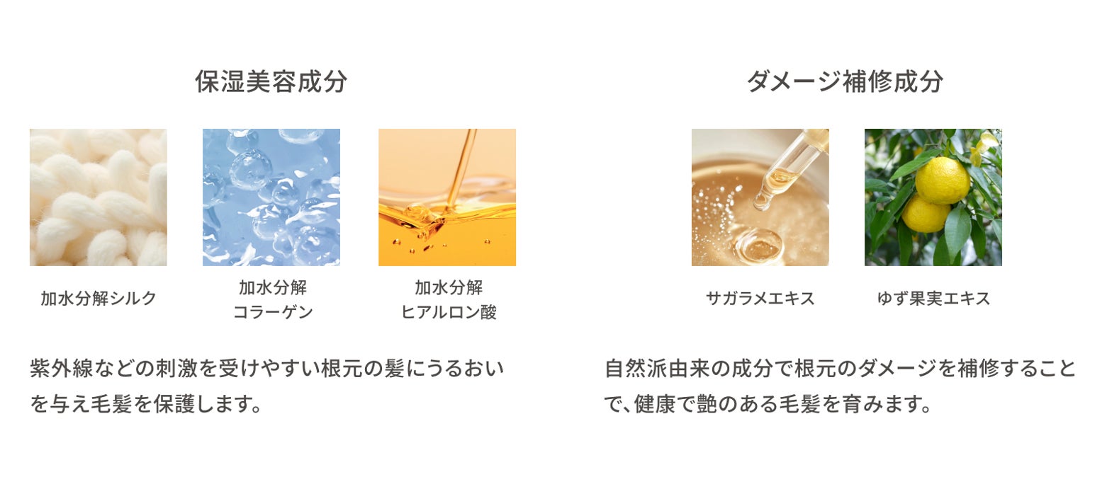 湿気が多い日でもしっかりまとまるパワフルキープ処方。美容成分の配合により、使い続けることで根元のふんわり感と艶やかな髪を実現します。
