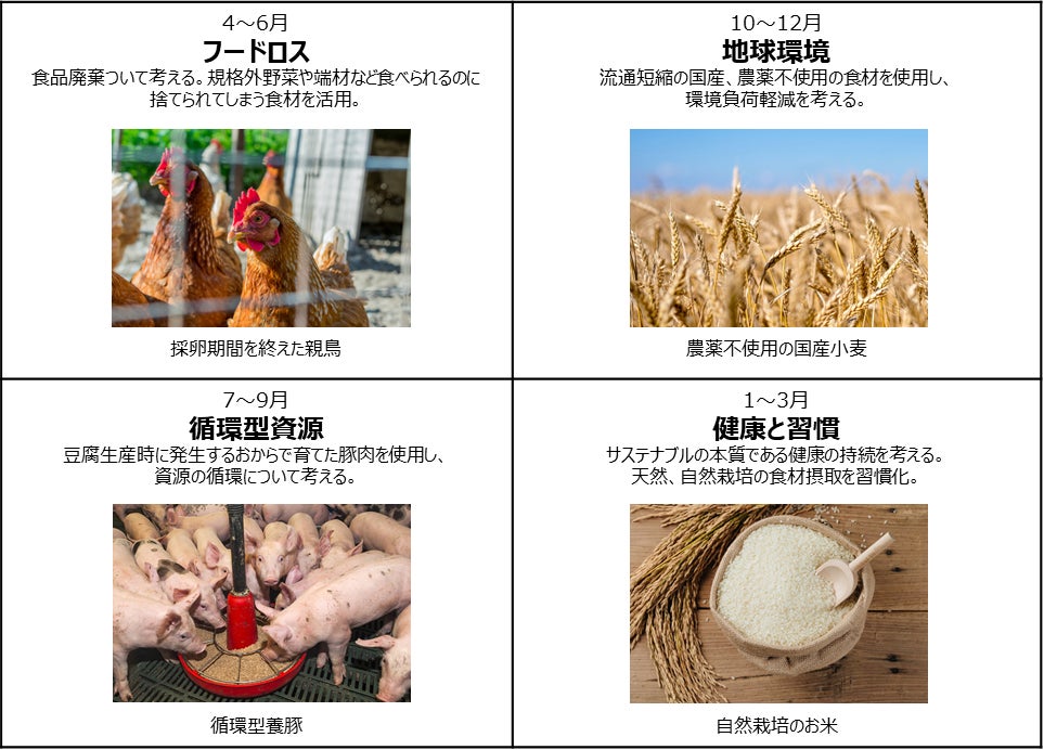「フードロス」「循環型資源」「地球環境」「健康と習慣」と4つのテーマを設定し、3か月ごとにテーマに沿ったメニューを展開します。