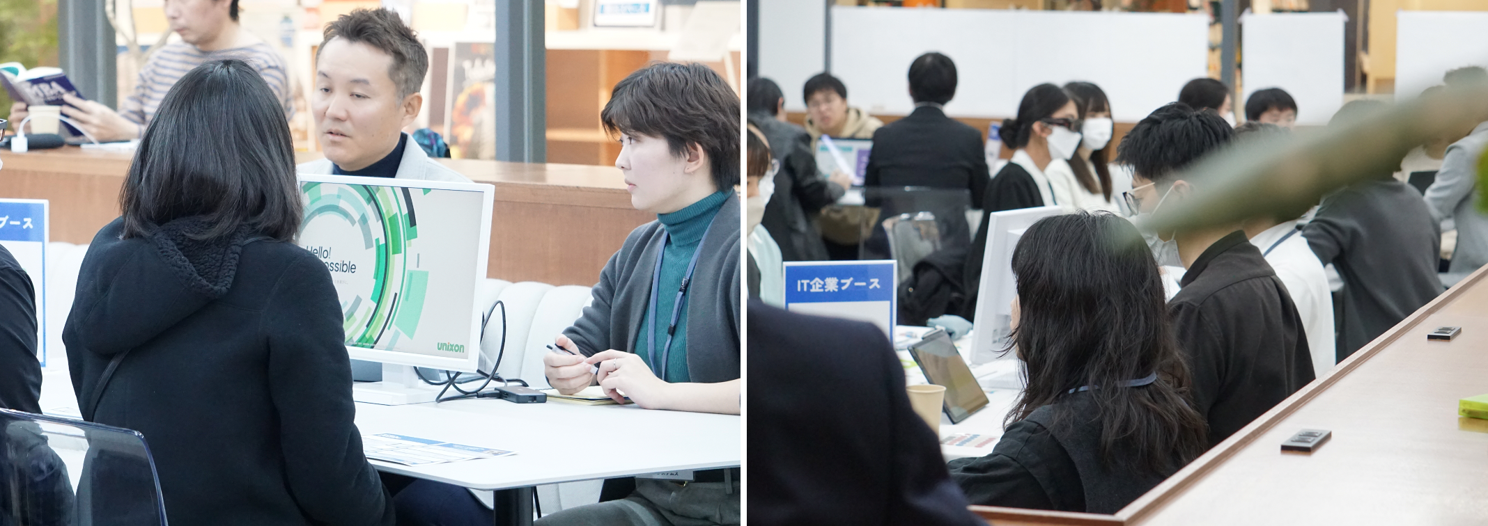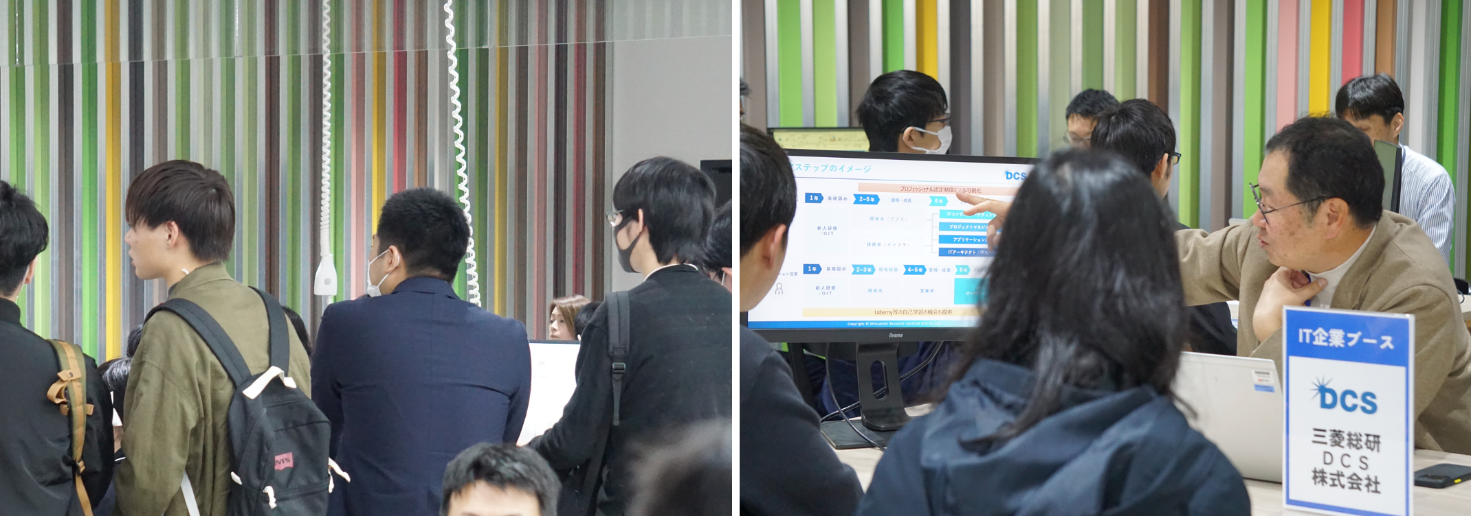 会場のIT企業ブースでは、IT企業10社がブースに訪れた参加者に対し、IT業界の魅力やメリット、これからの可能性、自社の強み、また就活におけるポイントなど、実際に働く人のホンネを伝え、参加者の就職・転職における活動をサポート。