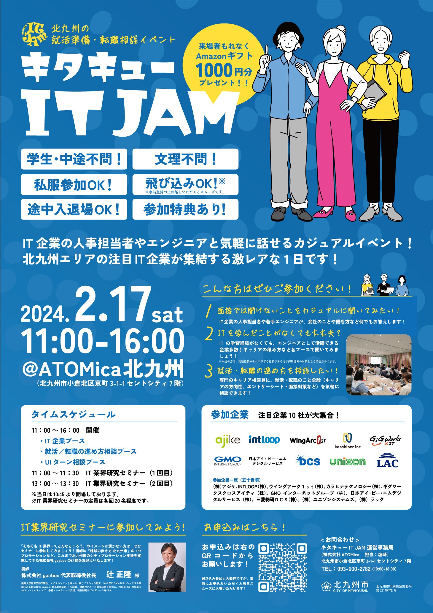 ソーシャルコワーキングスタートアップの株式会社ATOMica(本社:宮崎県宮崎市、代表取締役:嶋田 瑞生、南原 一輝、以下ATOMica)が運営するコワーキングスペース「ATOMica北九州」で、2024年2月17日(土)に北九州市主催の就活準備・転職相談イベント『キタキュー IT JAM』が開催されました。