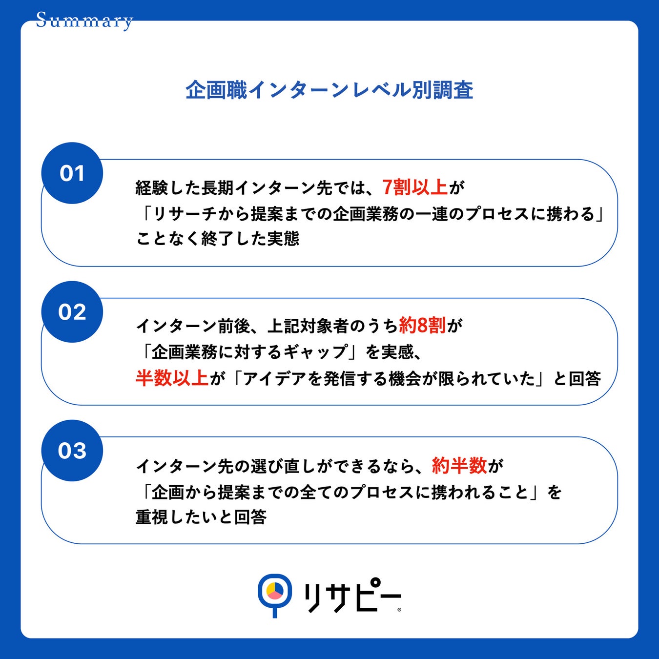企業職として長期インターンを実施しても、7割以上が「リサーチから提案までの企画業務の一連のプロセスに携わる」ことなく終えた実態が明らかとなり、うち約8割の方が思い描いていた企画職の経験が積めず、インターン前後において「企画業務に対するギャップ」を実感していたことが分かりました。感じたギャップとしては、半数以上が「アイデアを発信する機会が限られていた」と回答しており、裁量としても「上司に提案できるレベルまで」が多い傾向にあったようです。