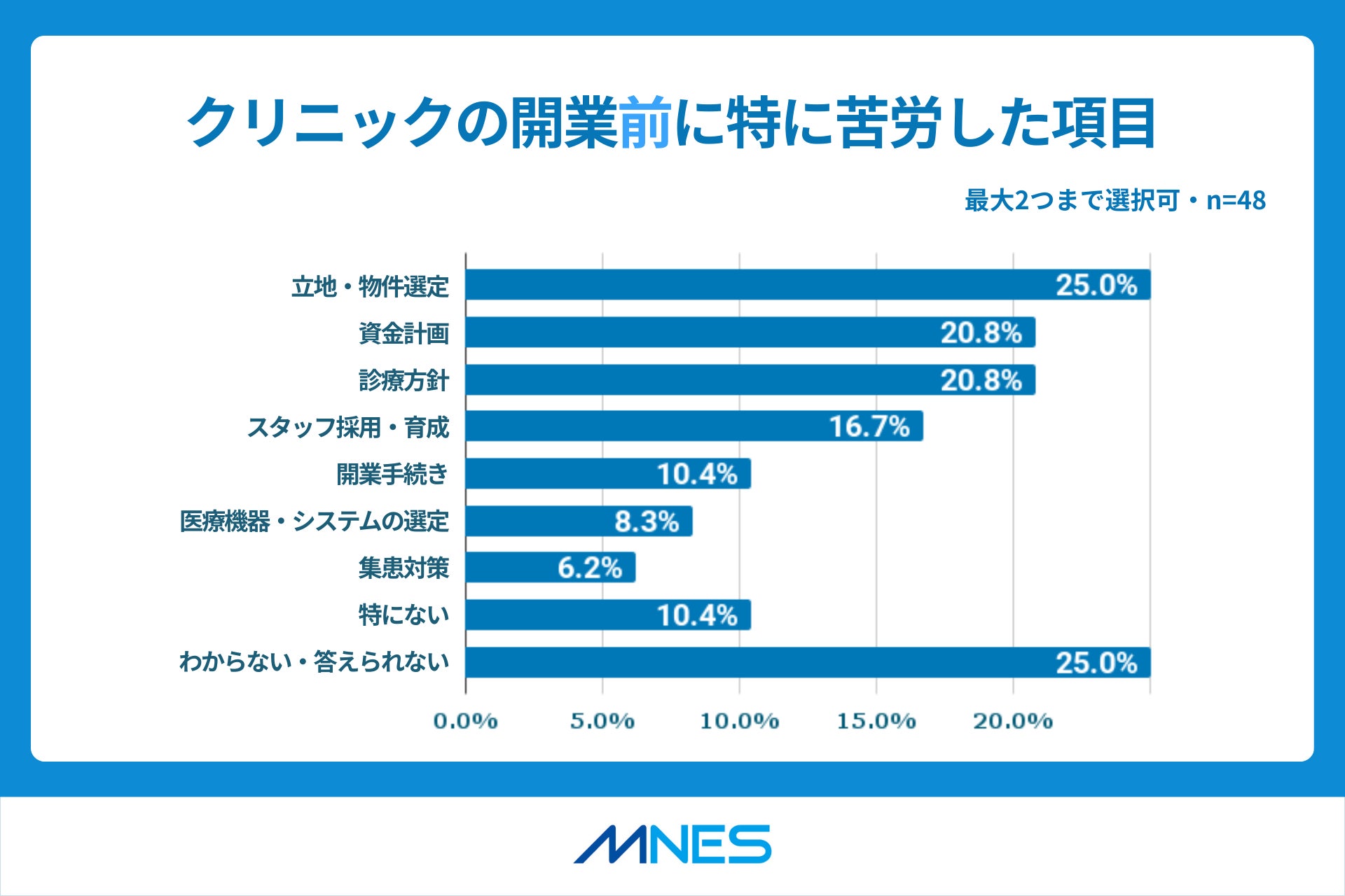 クリニックの開業前に特に苦労した点は「立地・物件選定」の回答が最多の25.0%