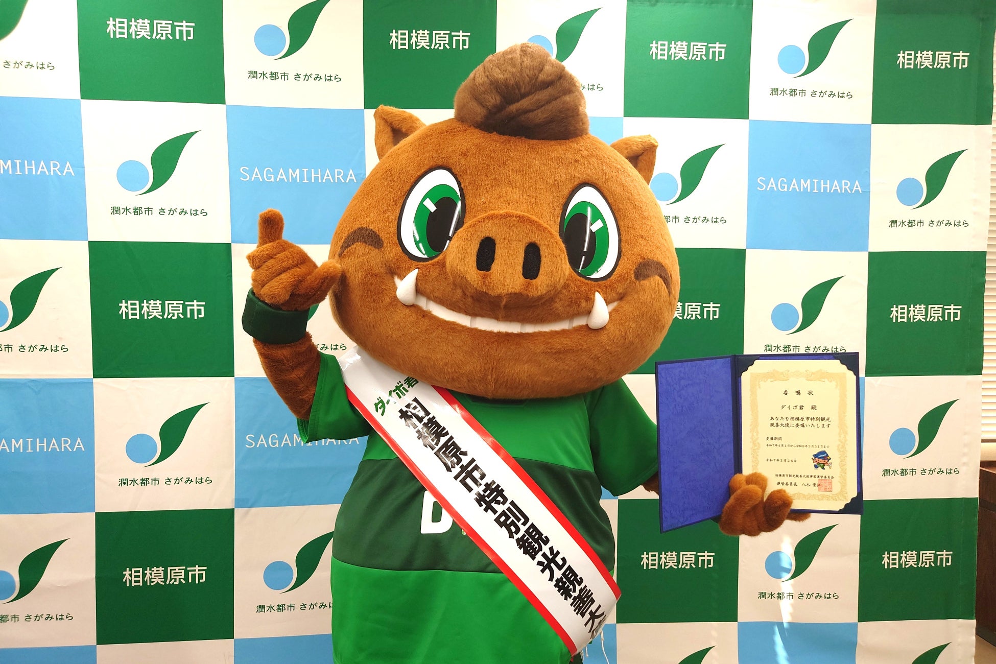 2025年3月26日、相模原市役所にて開催された就任式において、ダイボ君が「特別観光親善大使」としての委嘱状を受け取りました。委嘱期間は2025年4月1日から2026年3月31日です。式典では、本村賢太郎相模原市長から「ダイボ君の明るいキャラクターが市の観光振興に大きく貢献してくれることを期待しています」との激励の言葉をいただきました。