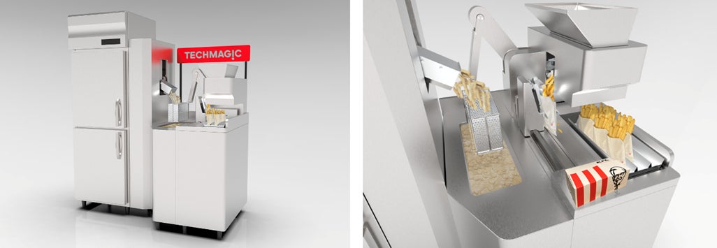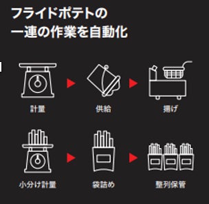 既存店舗の限られた厨房スペースにも十分設置可能な小型サイズの本ロボットは、現在従業員が手動で行っているフライドポテトの供給、揚げ調理、計量袋詰め、保管整列の一連の作業を自動化します。
