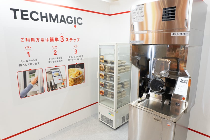TechMagic開発の炒め調理ロボット「I-Robo2」とミールキットを収容した冷蔵庫を社食、カフェやオフィスに設置していただき、社員の皆さまやお客様ご自身が投入したミールキットをロボットが調理することにより、いつでも誰でも出来立てアツアツの料理を楽しんでいただけるサービス。